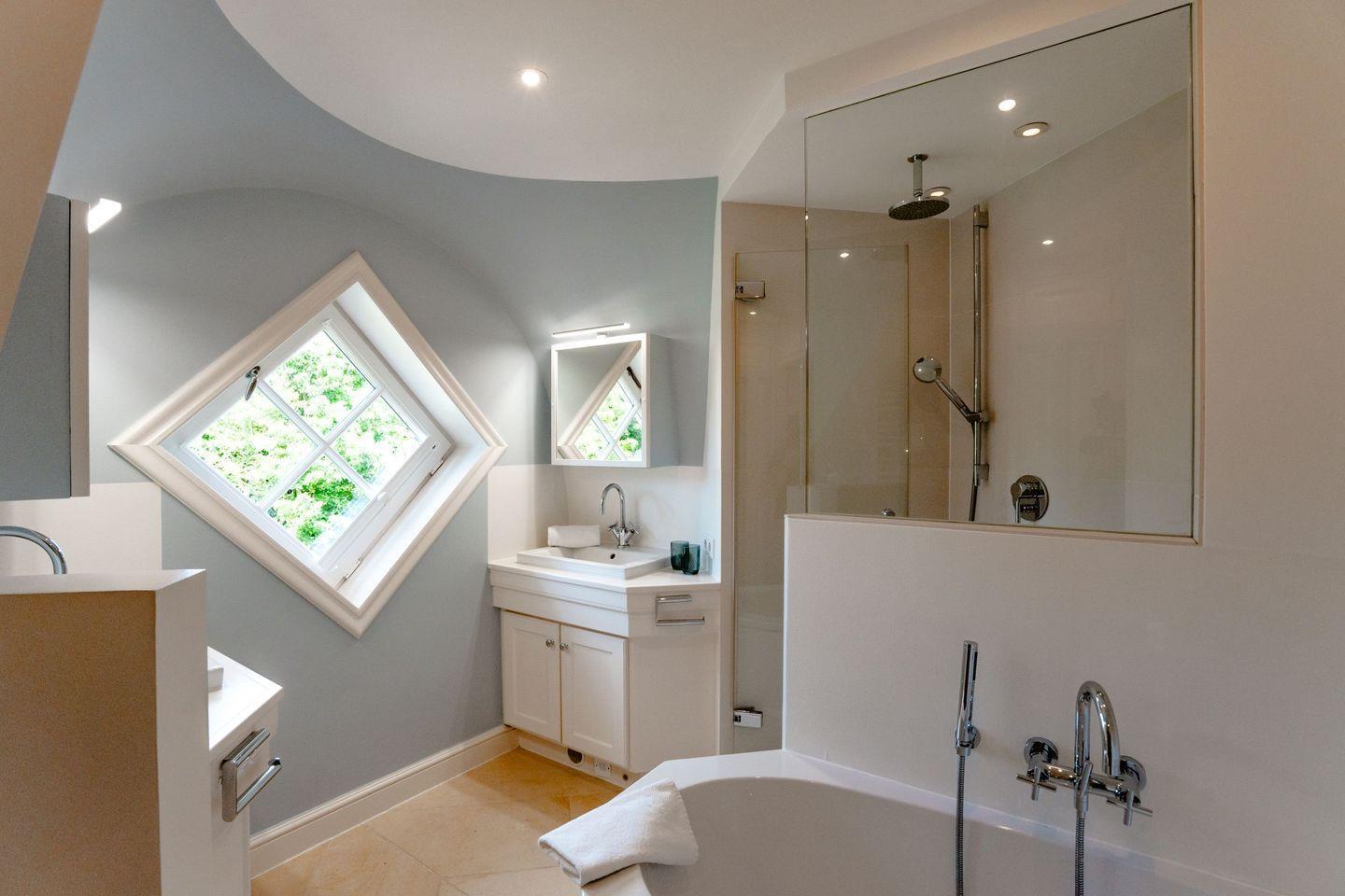 Im Obergeschoss befinden sich zwei große Schlafzimmer, jedes ebenfalls mit einem großen Flachbildfernseher ausgestattet. Auch aus den Schlafzimmern schauen Sie direkt in den wunderschönen Garten. Ein Vollbad sowie ein Duschbad mit Sauna sorgen für Wohlbefinden und Entspannung.