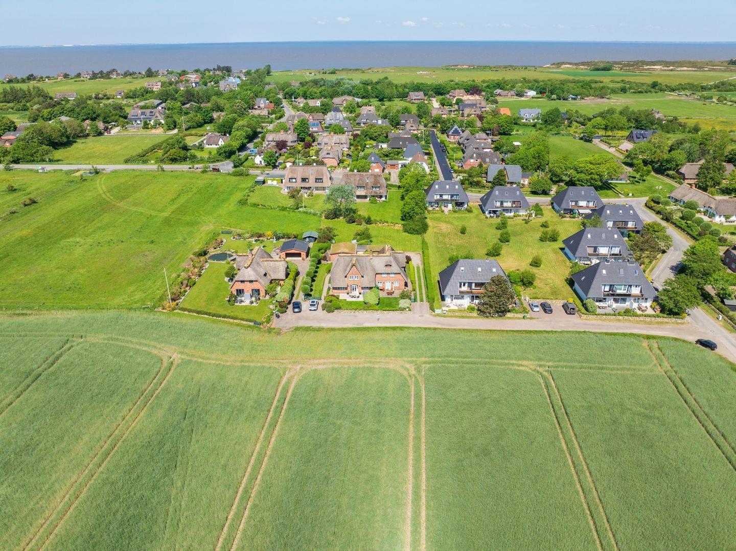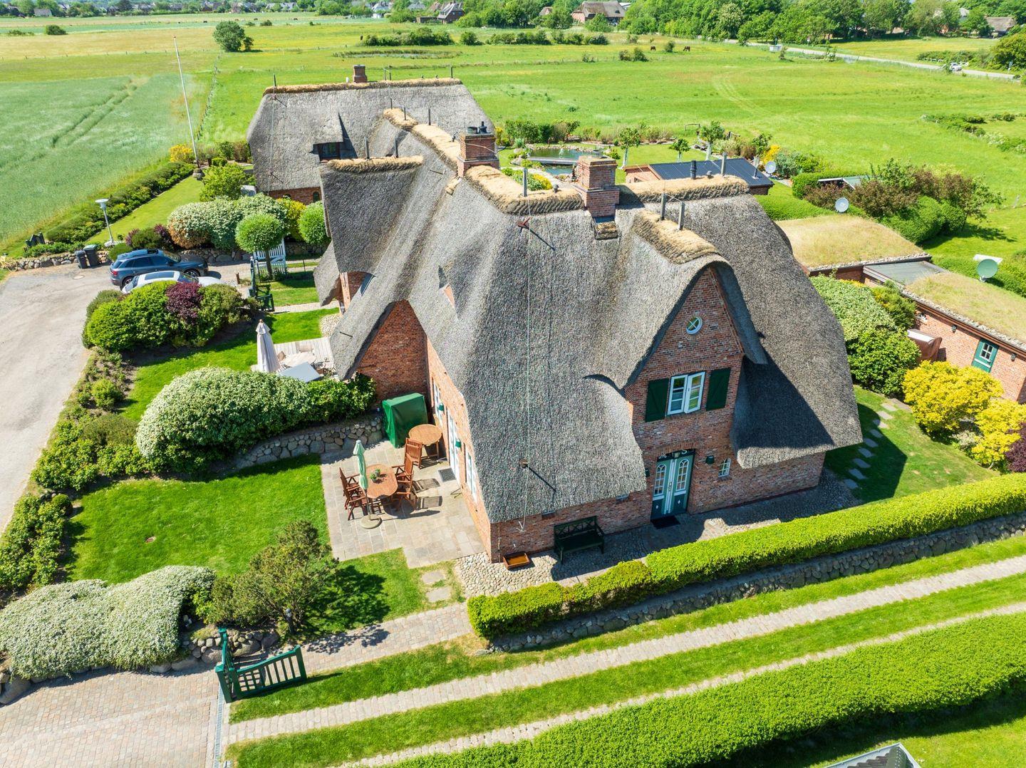 Doppelhaushälfte unter Reet in wunderschöner Lage! Dieses Anwesen bietet Ihnen Platz, Stil und Idylle in ruhiger Randlage unweit des Morsumer 18-Loch Golfplatzes. Dazu kommt ein Blick, der einem das Herz aufgehen lässt - über die Felder zum Deich und zum Wattenmeer. Aufgeteilt in EG und OG bietet Ihnen das Haus jede Menge Platz! Ein Doppelschlafzimmer und ein Dusch- / Wannenbad befinden sich im Erdgeschoss. Vor und hinter dem Haus laden zwei Terrassen mit Gartenmöbeln und Strandkörben zum Entspannen ein. Zusätzlich befindet sich hinter dem Haus ein großer eigener Parkplatz mit Garage. Sylt Urlaub, wie er sein soll!