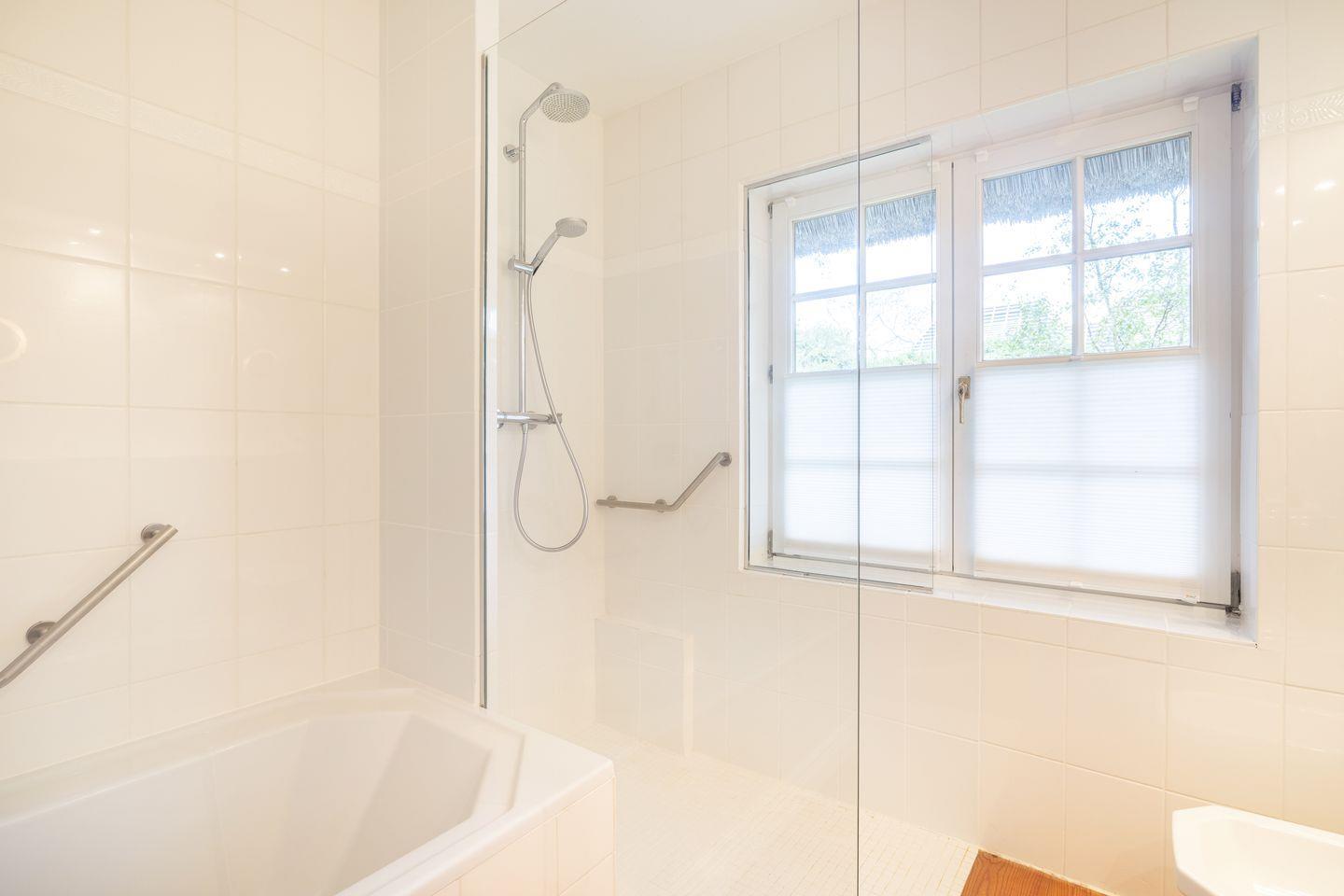 Im Eingangsbereich des einheitlich mit Echtholzdielen ausgelegten Hausteils ist ein separates Gäste-WC mit Fenster vorhanden und in einem von den Wohnräumen und der Küche durch einen Flur mit Sprossenfenstertür abgetrennten Schlaftrakt finden Sie ein großes Bad mit Dielenboden, großem Fenster, Walk In Glasdusche (behindertengerecht), Badewanne, Bidet, WC und vielen Ablageflächen. In allen Räumen finden Sie hochwertige Tischlereinbauten.