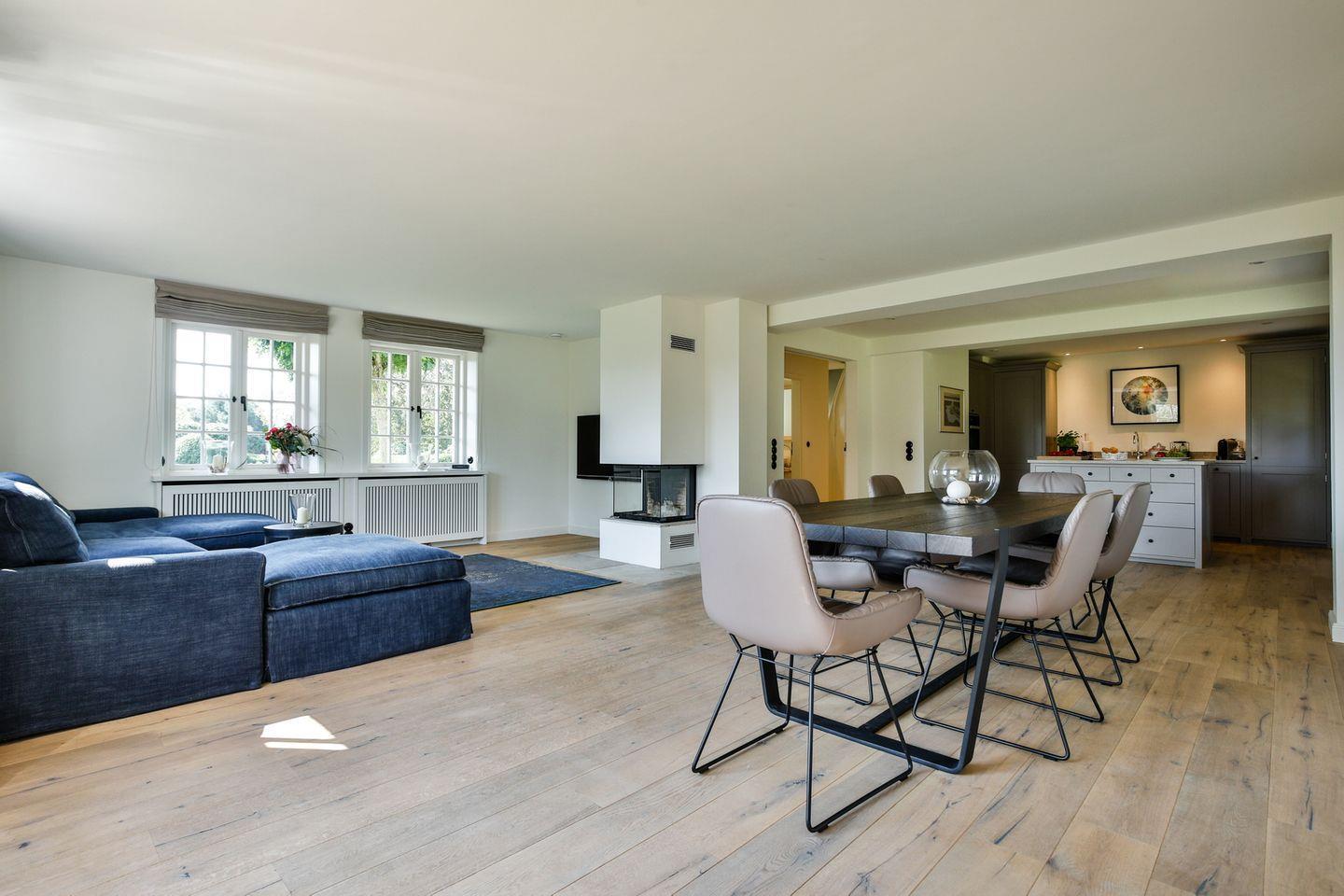 Wohn-/Essbereich sowie Küche: großer Raum mit gemütlicher Sitzecke vor dem Kamin sowie großem Esstisch mit Ledersesseln und offener Küche mit Küchenblock