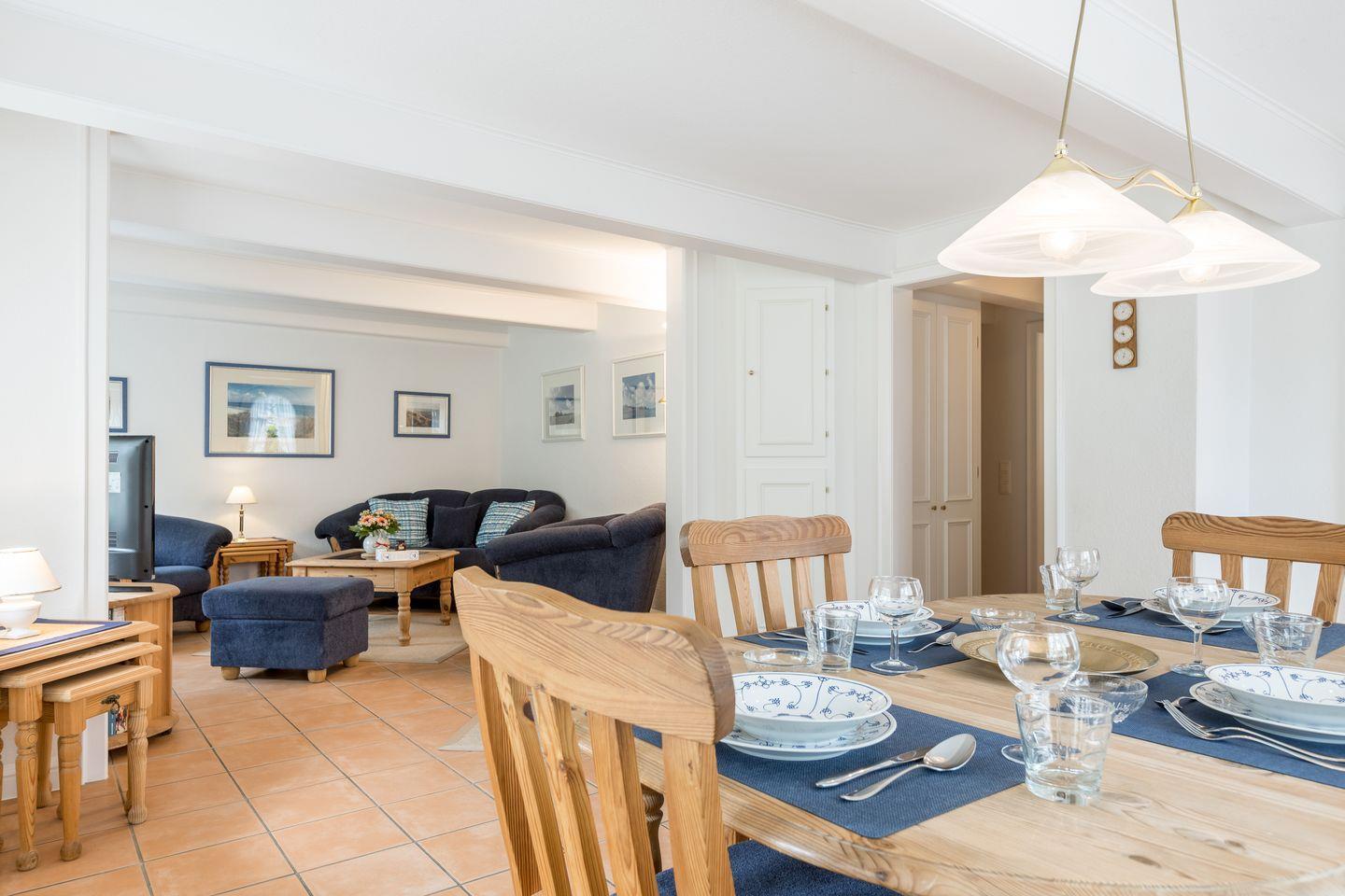 Wohn-/Essbereich: Wohnraum mit gemütlicher Couch, zwei Sesseln und Fußhocker als Sitzecke, Esstisch mit sechs Stühlen
