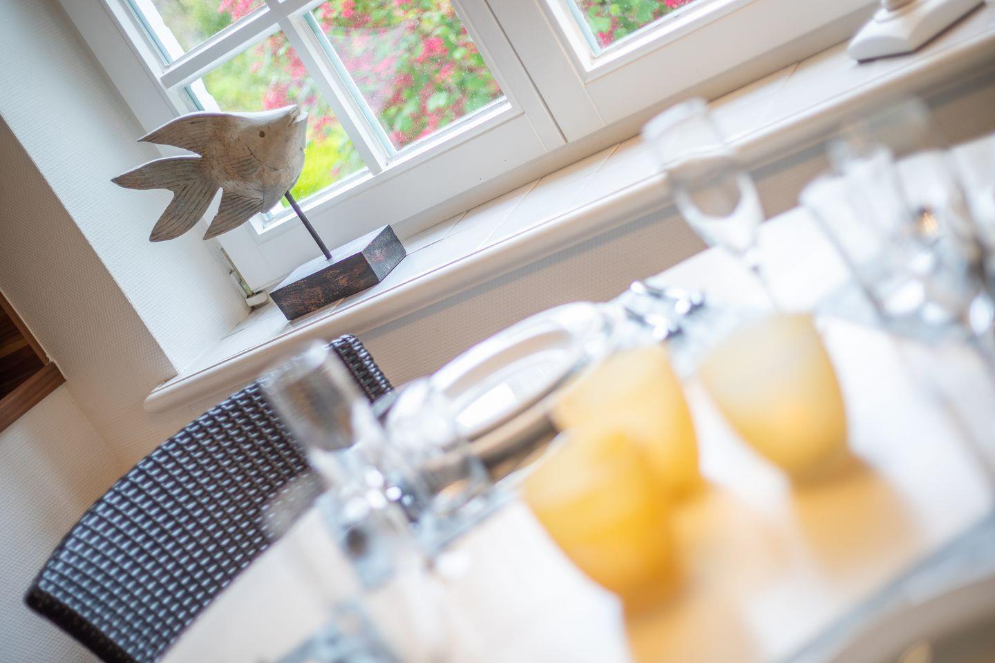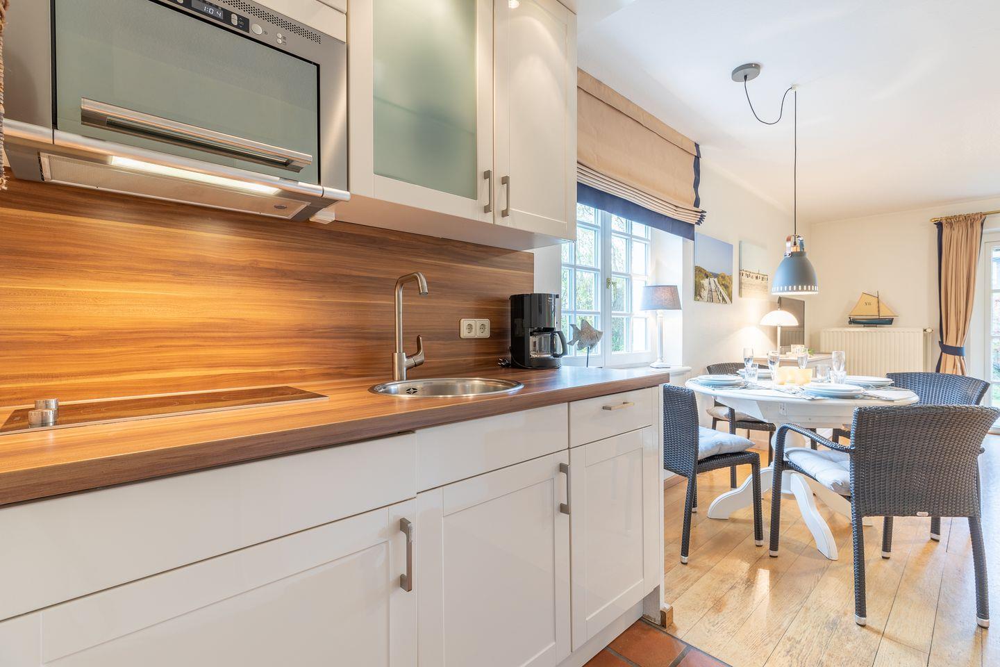 Im Erdgeschoss finden Sie einen offenen, hellen Wohnbereich, der mit gemütlicher Sofaecke, Esstisch sowie digitalen TV-Geräten (insgesamt zwei) zum Verweilen einlädt. Der angrenzende Essbereich sorgt für ein angenehmes Ambiente beim gemeinsamen Frühstück oder Abendessen.. Die offene Küche ist modern gestaltet und mit Induktionsherd, Kühlschrank, Geschirrspüler, Mikrowelle, Kaffeemaschine, Toaster sowie Wasserkocher vollständig eingerichtet.