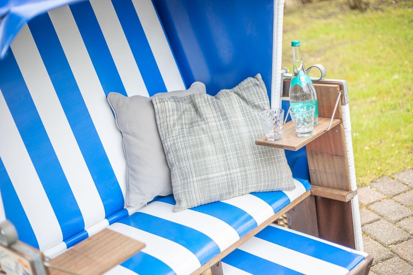 Im Außenbereich lädt eine private Terrasse zum Entspannen ein – ausgestattet mit Gartenmöbeln und eigenem Strandkorb. Der gepflegte Garten, der unmittelbar an die Terrasse anschließt, bietet weitere Möglichkeiten für Erholung. Für Ihren PKW steht ein kostenloser Privatparkplatz direkt an der Unterkunft bereit.