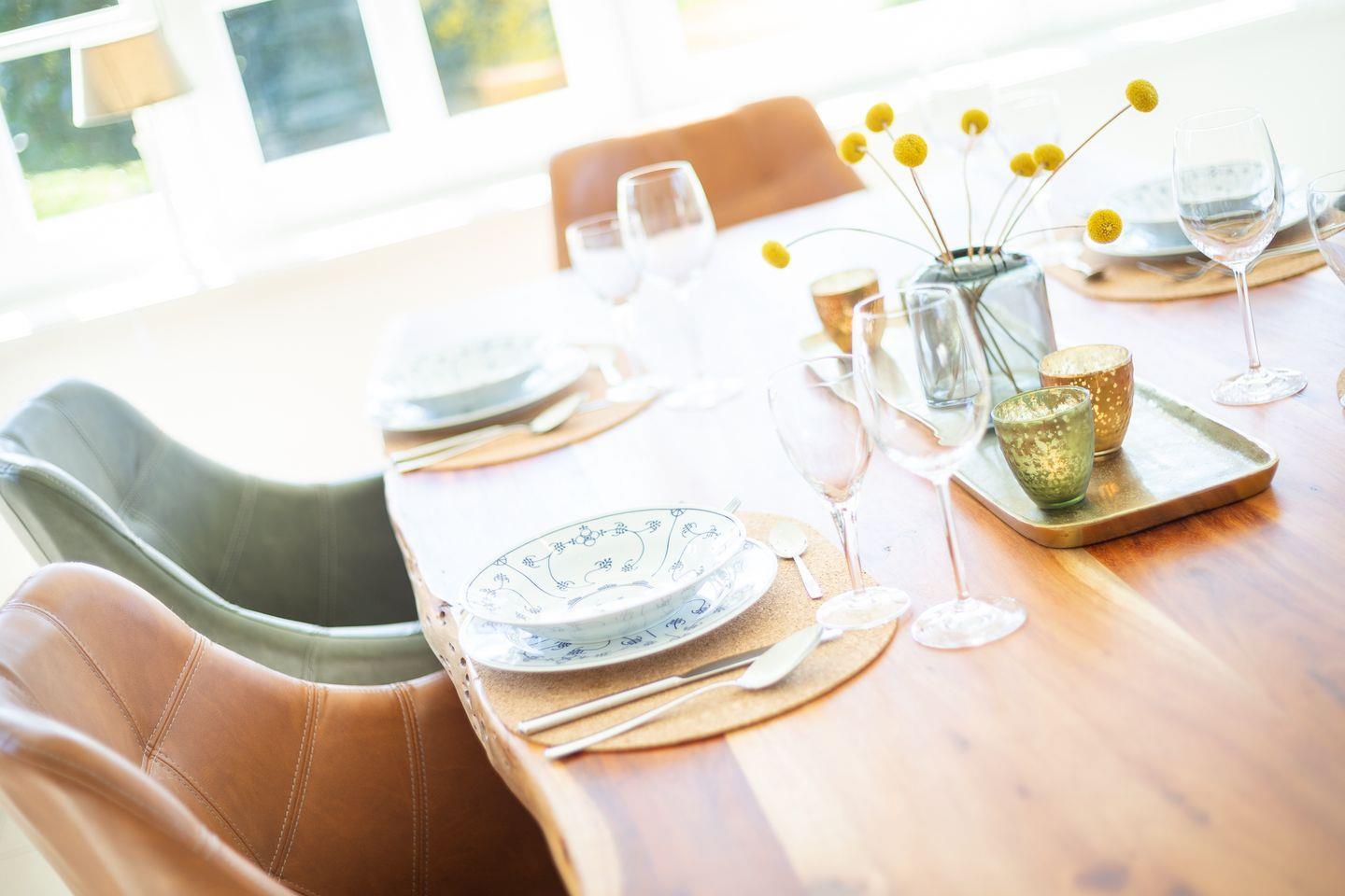 Wohn-/Essbereich: Wohnraum mit hochwertiger Couch, extra Leseecke mit zwei gemütlichen Ohren-Sesseln, angrenzender Essbereich mit langem Holztisch und sechs Ledersesseln mit TV