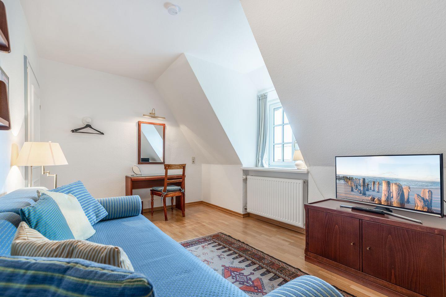 Schlafen 3/Wohnen 2: Schlafraum oder 2. Wohnraum mit Couchbett und TV sowie weißem Einbauschrank