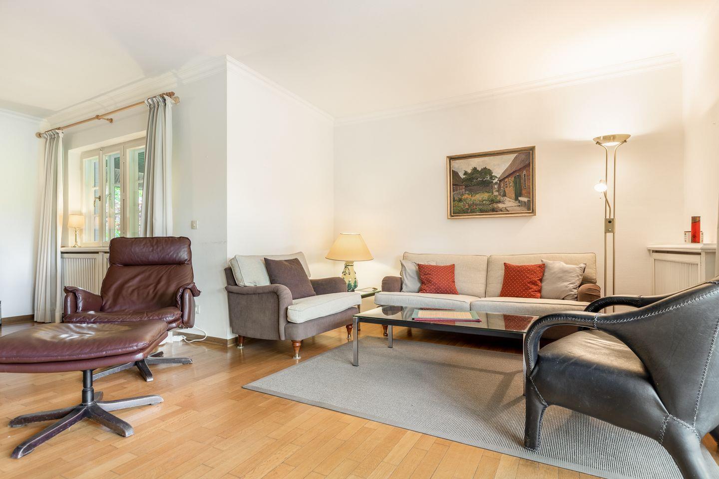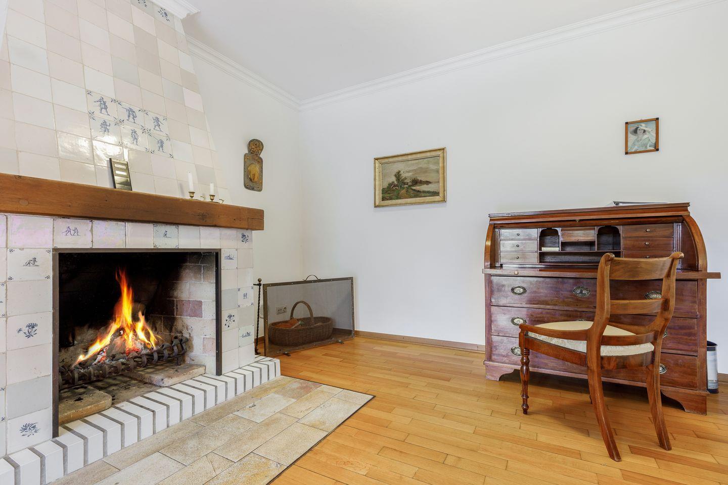 Wohnen 1: Wohnraum mit Kamin und Sekretär als Arbeitsplatz, Sitzgruppe (3er Couch und 2 Sessel)