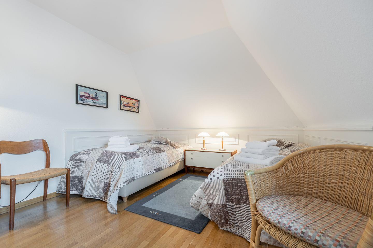 Schlafen 2: Schlafraum mit zwei Einzelbetten (Fußteil), kleinem Schrank und Safe