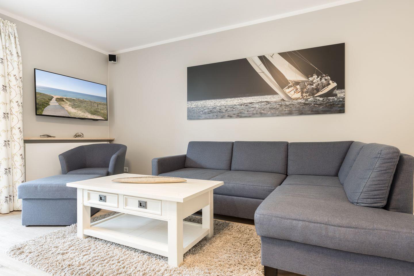 Wohn-/Essbereich: geräumiger Wohnbereich mit Eckcouch und Flat-TV; großer Esstisch mit sechs Stühlen