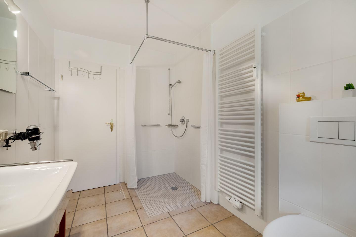 Badezimmer: weißes Bad mit ebenerdiger Dusche, Handtuchhalter, Kosmetikspiegel und Fön