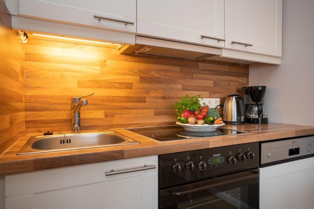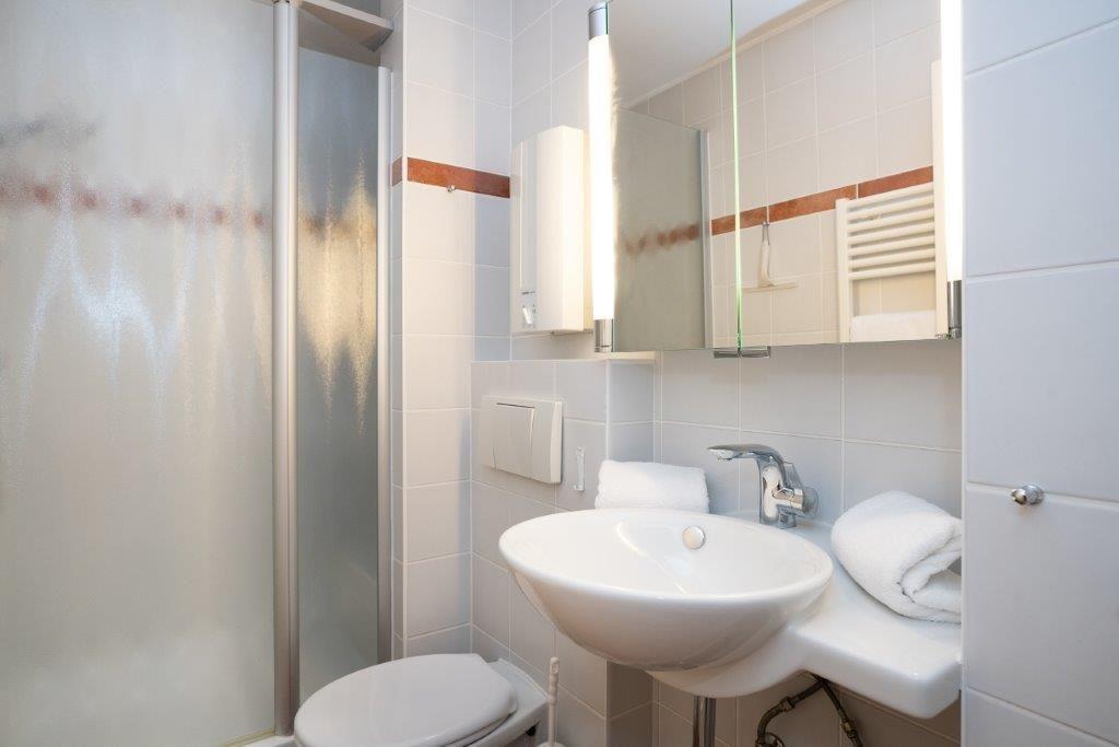 Obergeschoß: Wohnbereich mit Küche und Essplatz für 4 Personen und Zugang zum Balkon, Badezimmer mit Dusche und WC