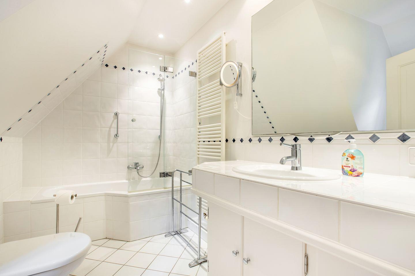 Bad: weißes Vollbad mit Fußbodenwärme, elektrischem Handtuchhalter und Kosmetikspiegel