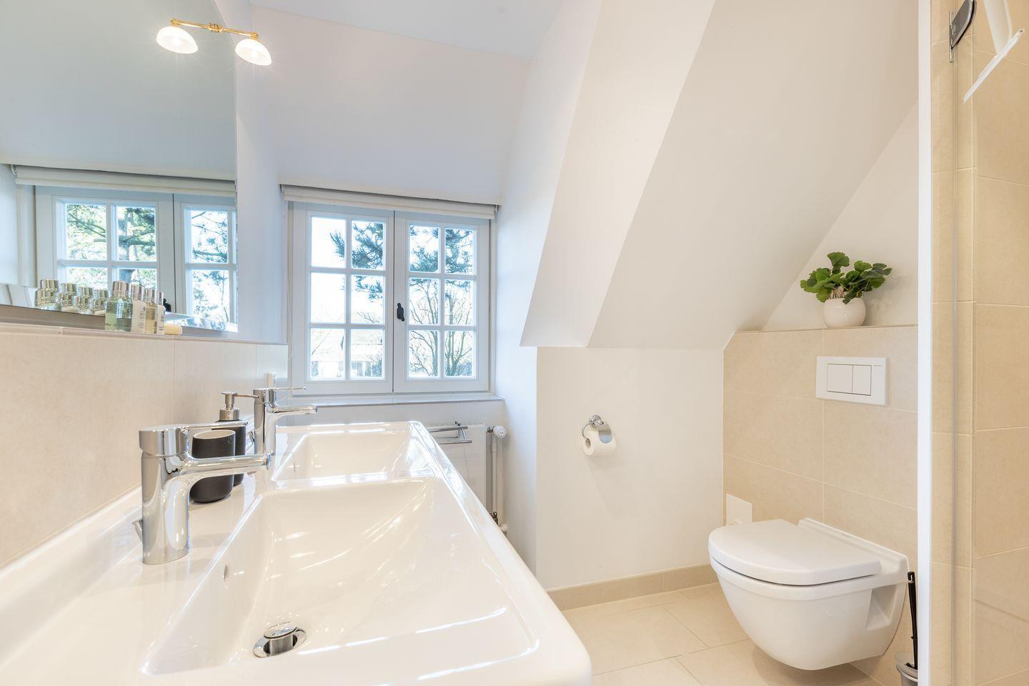 Badezimmer 1: Bad mit ebenerdiger Dusche, doppeltem Waschtisch und hoch modernen Natursteinfliesen