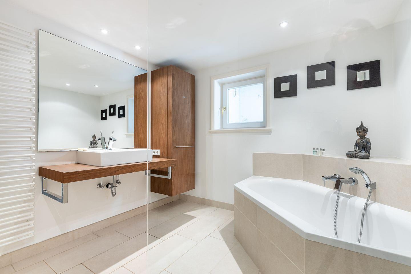 Badezimmer 2: Im Saunabereich ein Bad mit ebenerdiger Dusche, zusätzlicher Badewanne und ebenfalls hoch modernen Natursteinfliesen