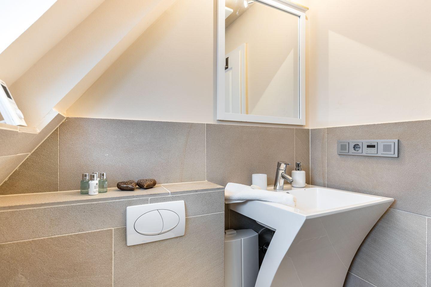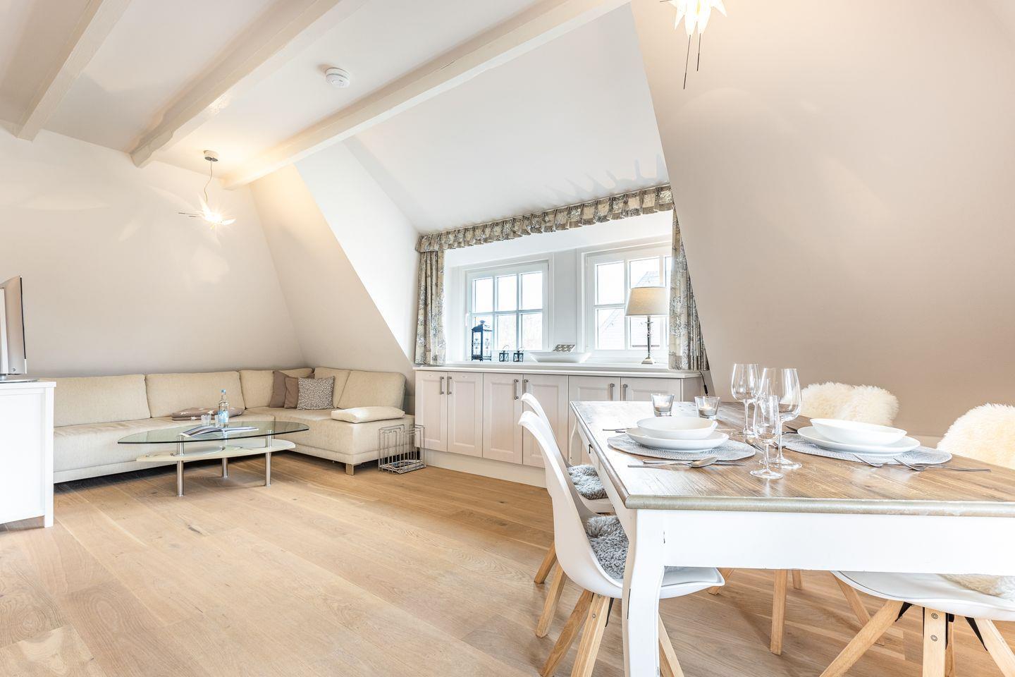 Diese kleine Maisonettewohnung im Ober- und Dachgeschoss wurde komplett renoviert und bietet mit ca. 40 m² Platz zum Erholen. Das reetgedeckte Haus liegt ruhig in einer Wohnparkanlage mit hohem Baumbestand und ist nur ca. 10 Gehminuten vom Wattenmeer entfernt. Durch helle Farben und modernes Mobiliar ist hier eine Wohlfühlatmosphäre für bis zu zwei Personen entstanden. Die Wohnung verfügt über Komfort wie Sauna (Infrarot), Flat-TV mit Apple TV, Sonos-Bluetooth-Box, Radio, Geschirrspüler, Nespresso Kaffeemaschine, Mikrowellenbackofen als Kombi, Cerankochfeld, Fußbodenheizung und Waschtrockner.