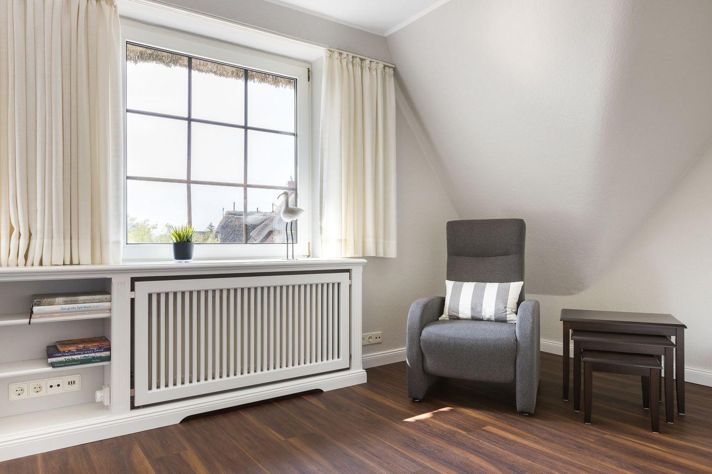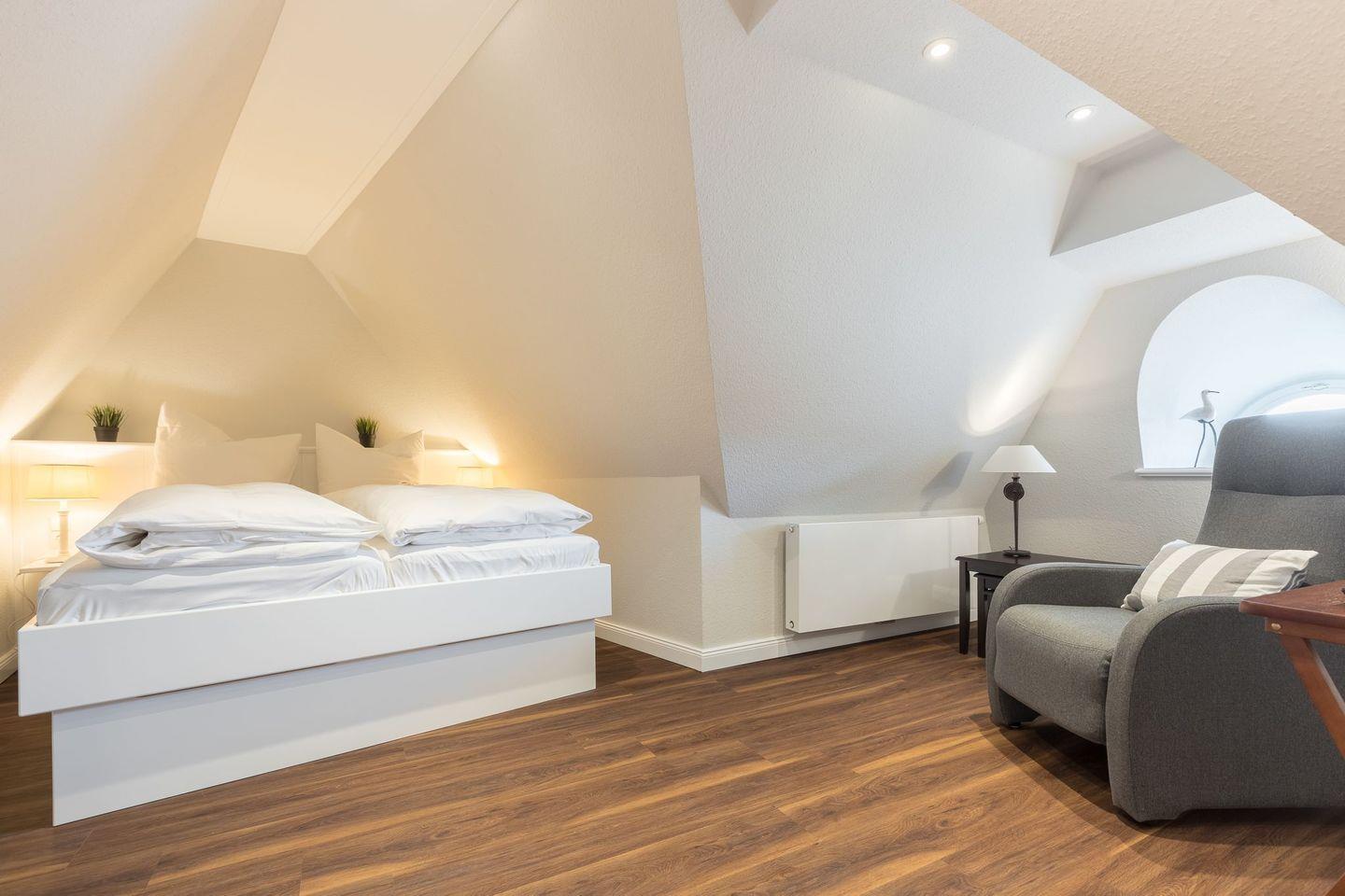 Schlafen 2: Schlafraum mit Boxspringbett (ca. 160 x 200 cm) unter der Dachschräge, Einbauschrank und Korbsessel