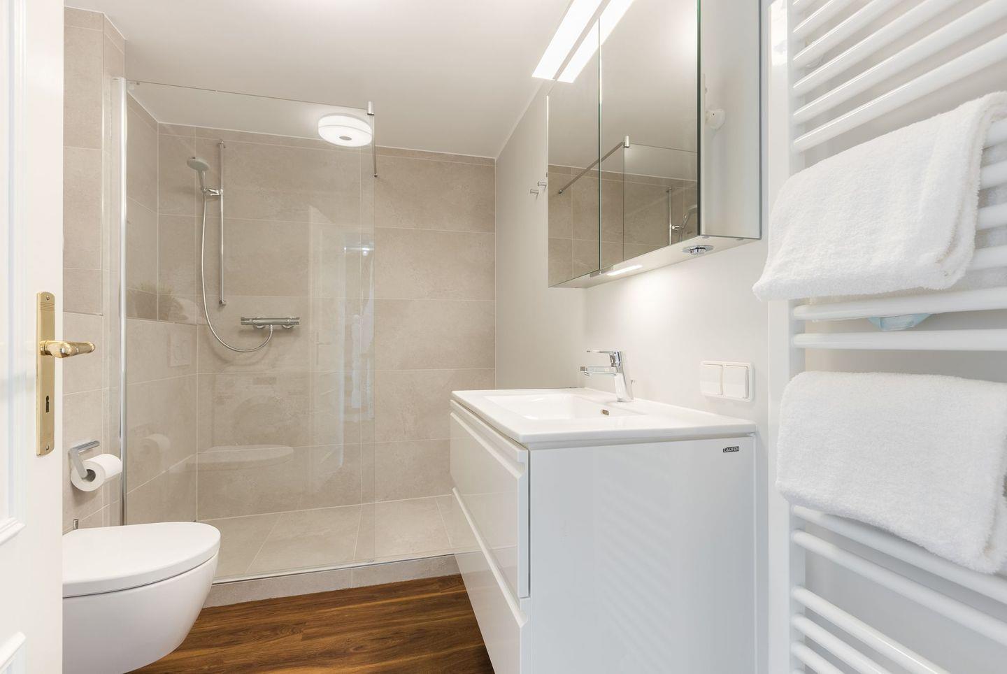 Bad: modernes, großes Duschbad mit Waschtrockner