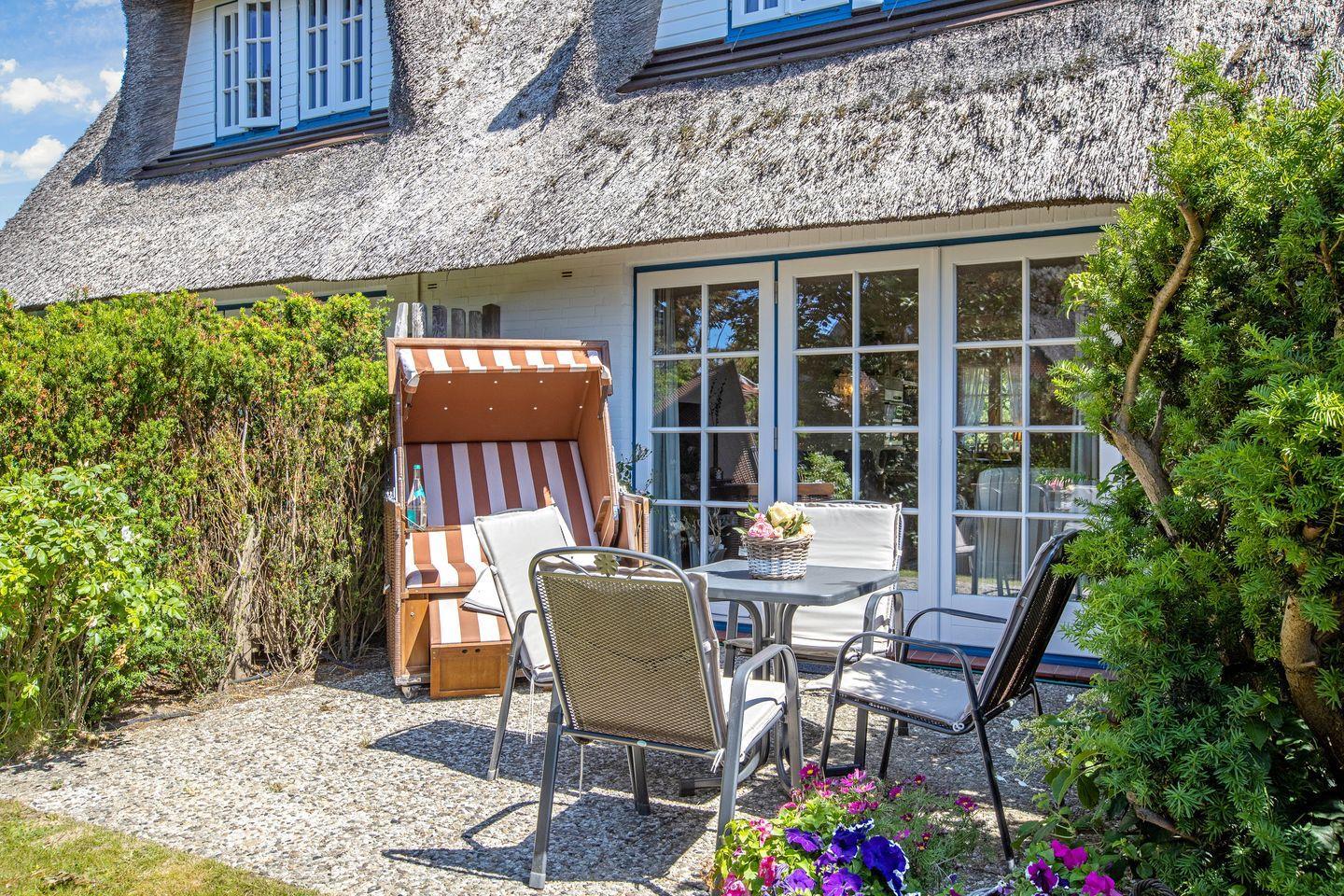Das reetgedeckte Haus liegt im Süden von Keitum in Richtung Wiesen und Deich.