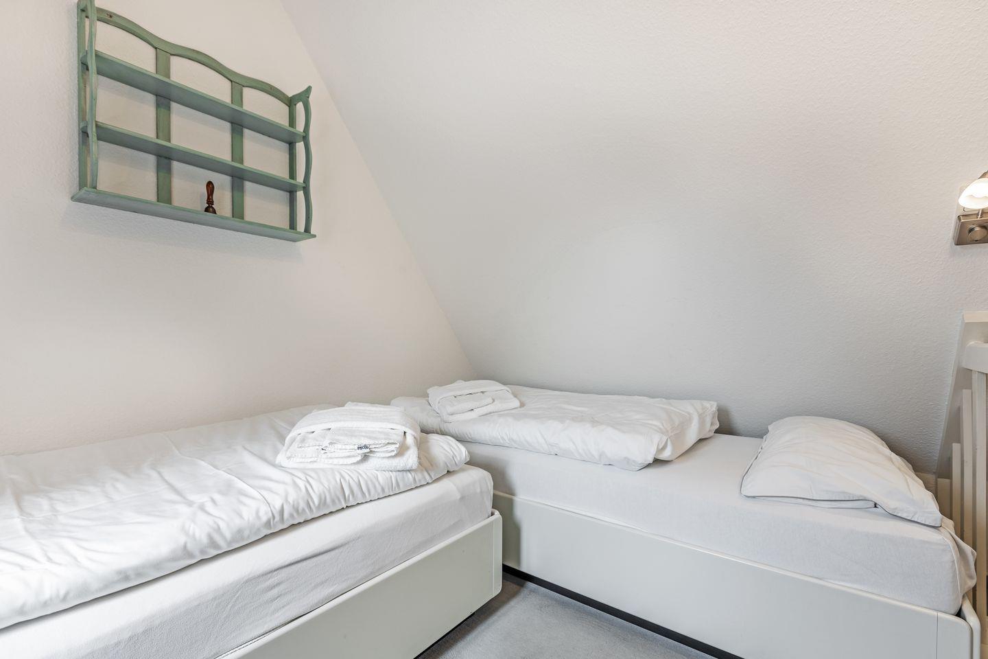 Über eine Treppe gelangen Sie in den Schlafbereich im offenen Dachgeschoss mit 2 Einzelbetten ( steile Treppe )