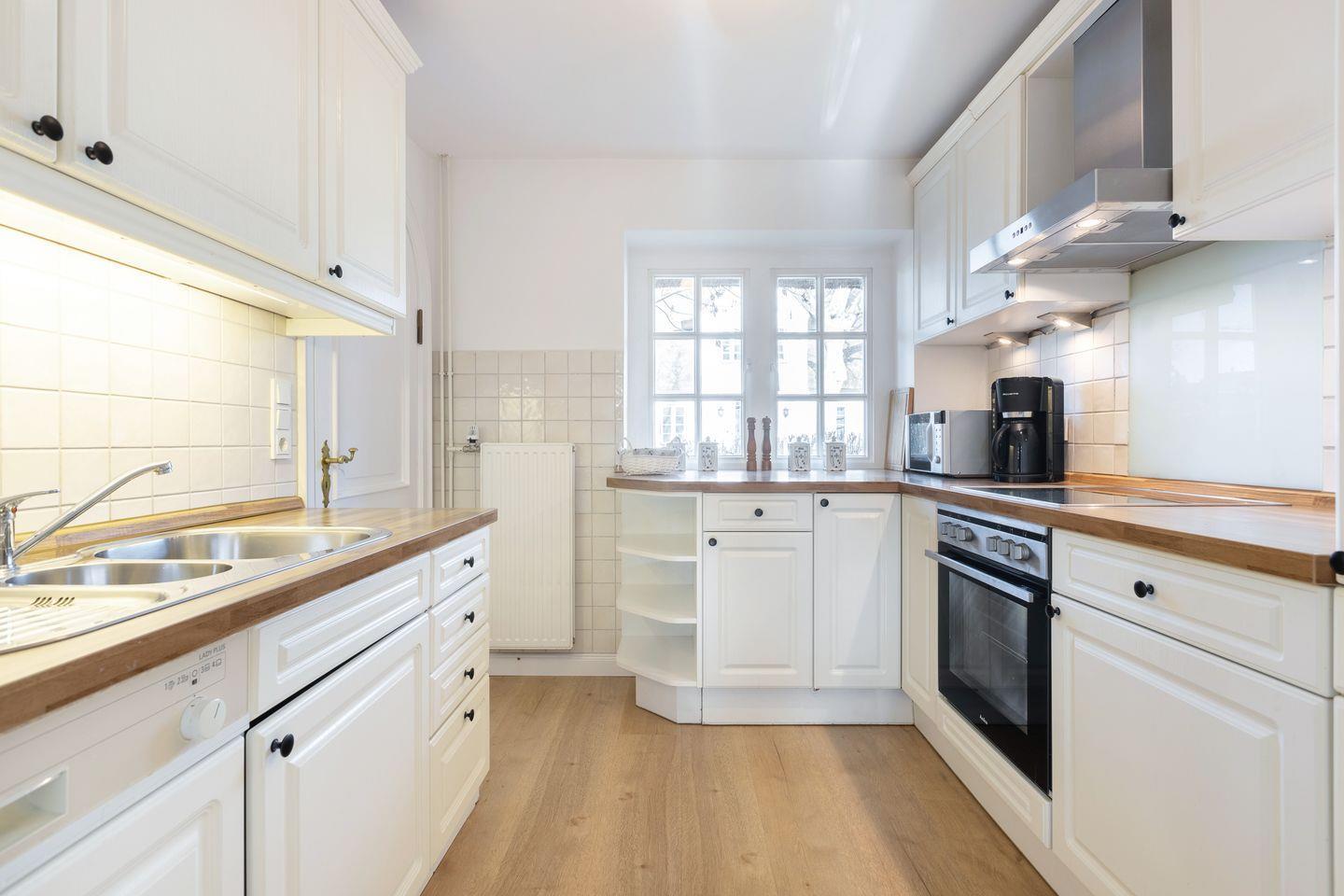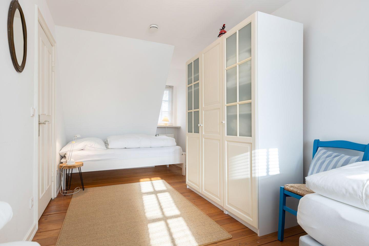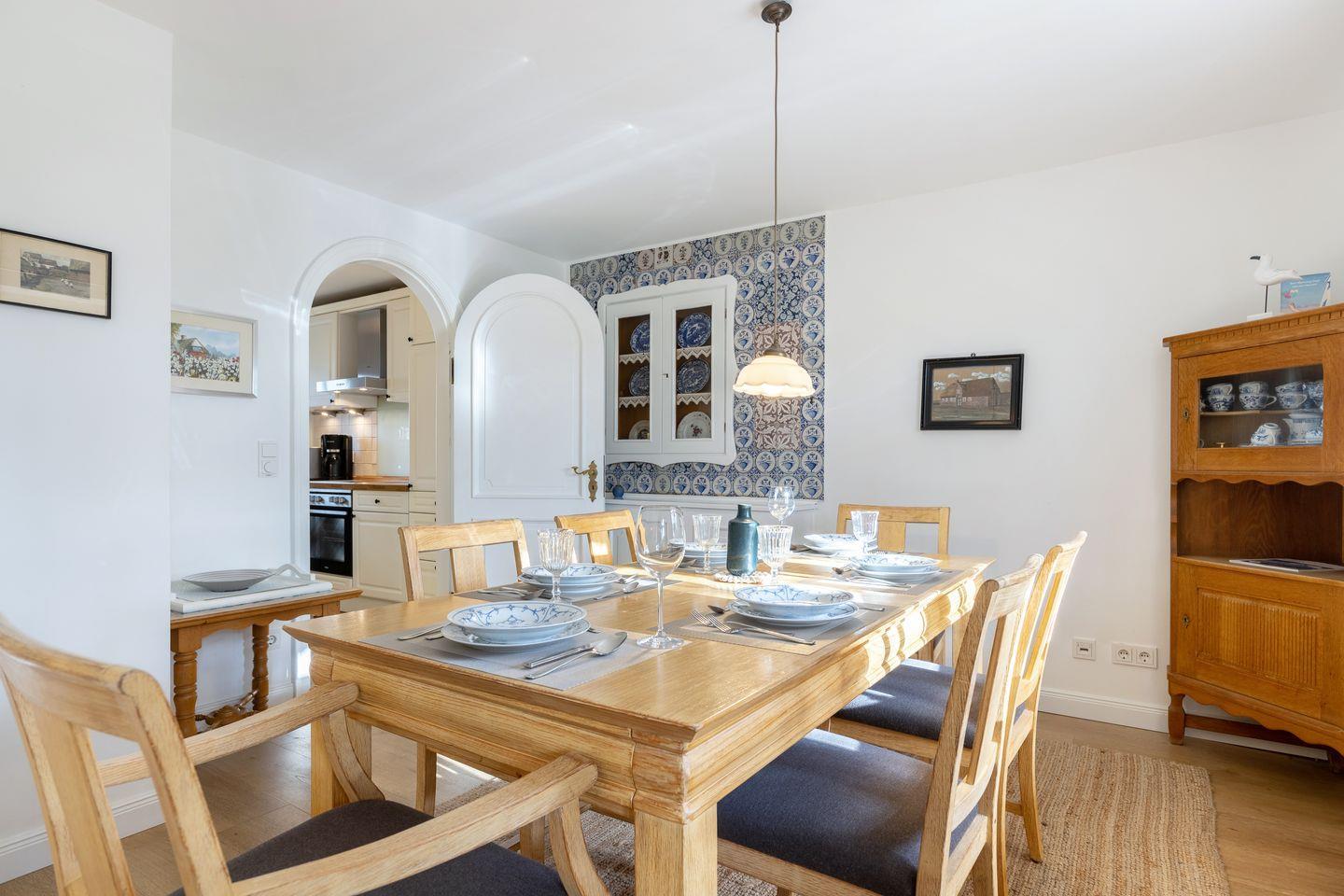 Das Mittelhausteil Paula ist mit ca. 85 m² der größte Gebäudeteil – geeignet für bis zu 5 Personen. Paula ist im Landhausstil teils mit historischen Elementen (Delfter Kacheln, Holzböden, etc.) ausgestattet. Im Erdgeschoss gibt´s einen großen Wohn- /Essbereich sowie eine Landhausküche mit allem Komfort (GS, Cerankochfeld, Backofen, Mikrowelle, etc.). Das Bad im EG ist hell und geräumig (Fußbodenheizung, Designwaschtisch und Badewanne). Hier steht zusätzlich eine Waschmaschine zur Verfügung. Im Dachgeschoss - mit Friesengiebel und Reetdachgauben – gibt es zwei große Zimmer (ein Elternschlafzimmer mit großem Doppelbett, Einbauschrank im friesischen Stil und eigenem Duschbad, ein großes Kinderzimmer mit 3 Betten). Ein niedlicher Mußeplatz in der Galeriezone unter dem Friesengiebel lässt den Alltag vergessen. Die Gartenmöbel und der Strandkorb stehen Ihnen von ca. April - Oktober zu Verfügung.