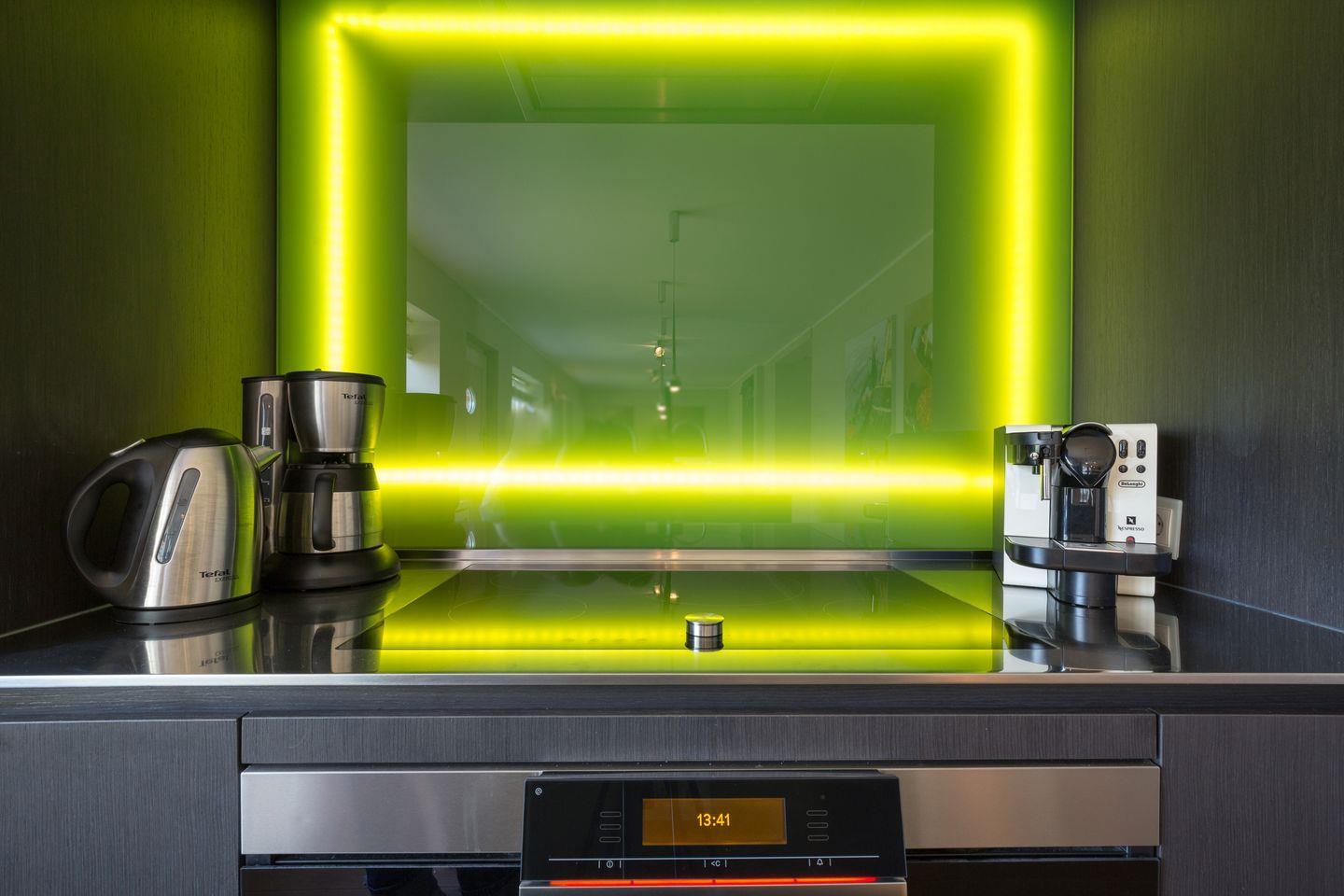 Großzügiges und sehr geschmackvoll designtes Entrée mit edlem Wohnbereich, Flat-TV, Blu-Ray Player und iPod-Dock. Futurisches Gourmet-Küchen-Ensemble mit Induktionsherd, und Geschirrspüler. Stilvoller Essbereich, atmosphärisch einer Landhaus-Wohnküche gleichend. Gäste-WC. Sehr aufwändig angelegter, geschützter und mit edlem Holz voll-verkleideter Innenhof mit Gartenmobiliar, Sauna mit Ambiente-Licht, Außendusche und Loungebereich. (Gartenmobiliar u. Loungebereich ca. von April-Oktober nutzbar.). Garage für Ihr Fahrzeug mit direktem Haus- und Saunazugang.