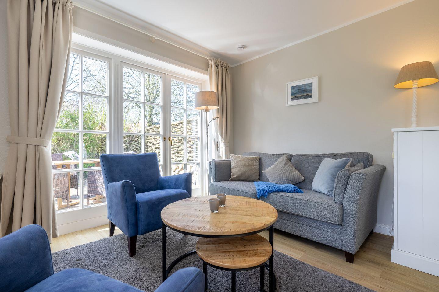 - Wohn- Essbereich mit kleine Küchenzeile mit Mikrowelle, Geschirrspüler, von hier aus haben Sie Zutritt zur Terrasse mit Gartengestühl (April bis Oktober) und der Sonnenkuhle mit einem Strandkorb ( Westlage)