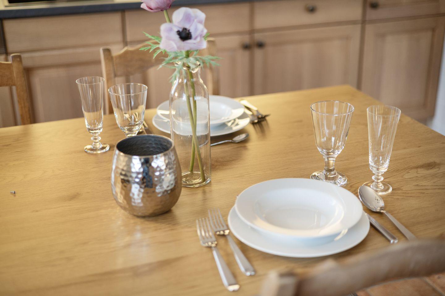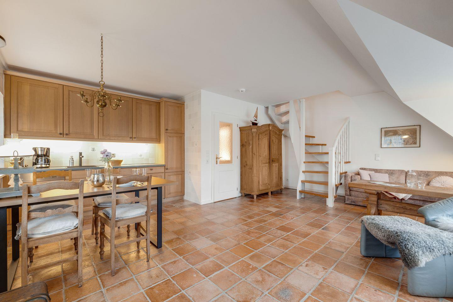 Die Wohnung verfügt über ein gemütliches Schlafzimmer mit Doppelbett (200x200cm) und einem großzügigem Kleiderschrank, in dem Sie erholsame Nächte verbringen können, und ein großzügiges Wohnzimmer mit einer Sofaecke, die zum Verweilen einlädt. Hier können Sie nach einem erlebnisreichen Tag auf der Insel entspannen, während Sie Ihren Lieblingsfilm auf dem Fernseher mit Kabelanschluss schauen oder einfach nur die Atmosphäre genießen. Die offene Küche ist voll ausgestattet mit modernsten Geräten, darunter ein Cerankochfeld, Geschirrspüler, Kühlschrank und eine Nespresso-Maschine, damit Sie Ihren Morgenkaffee ganz nach Wunsch zubereiten können. Der Esstisch im Essbereich bietet genügend Platz für gemütliche Mahlzeiten.