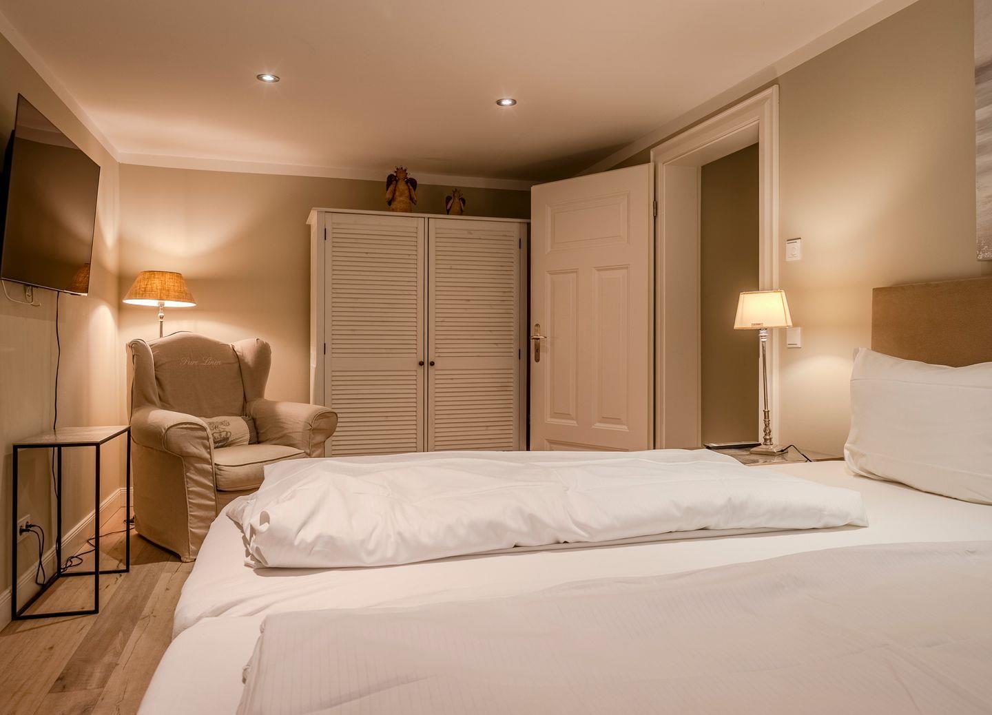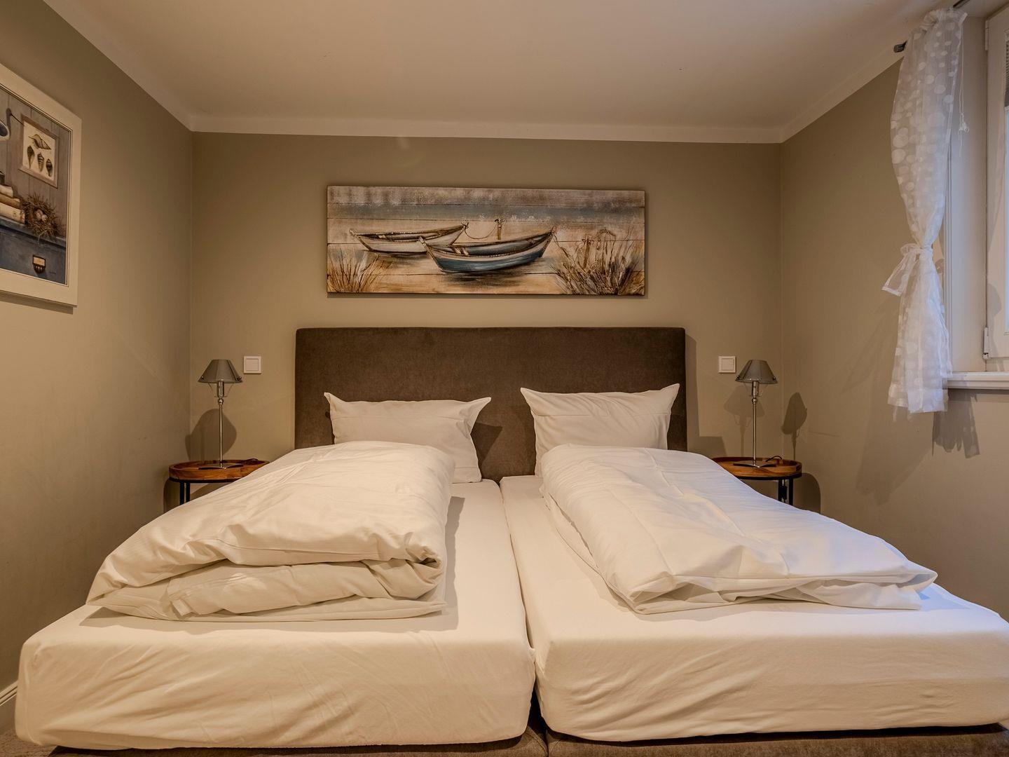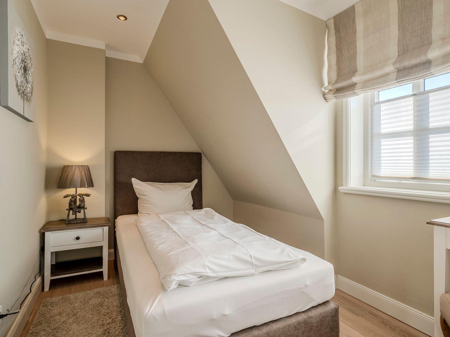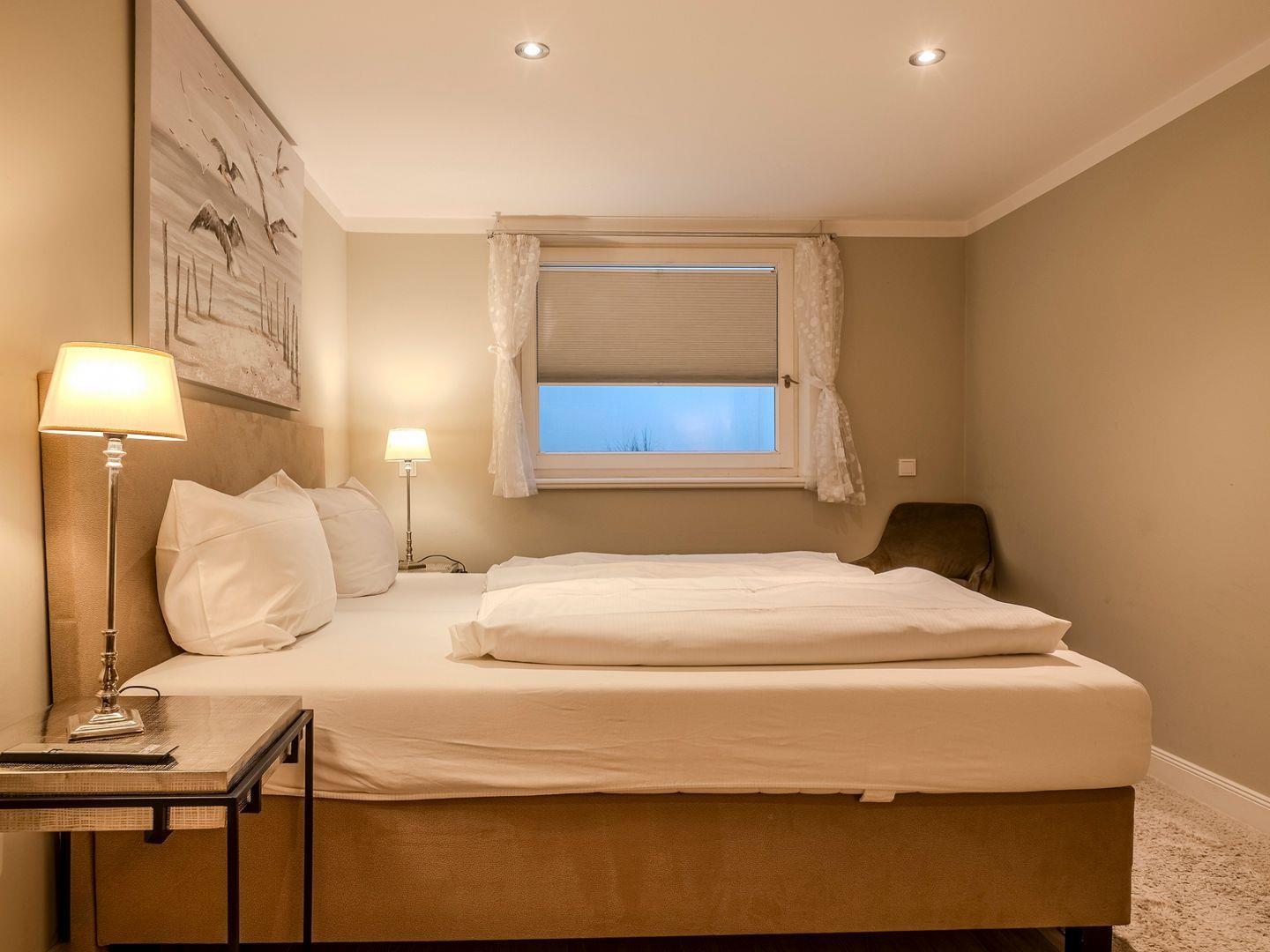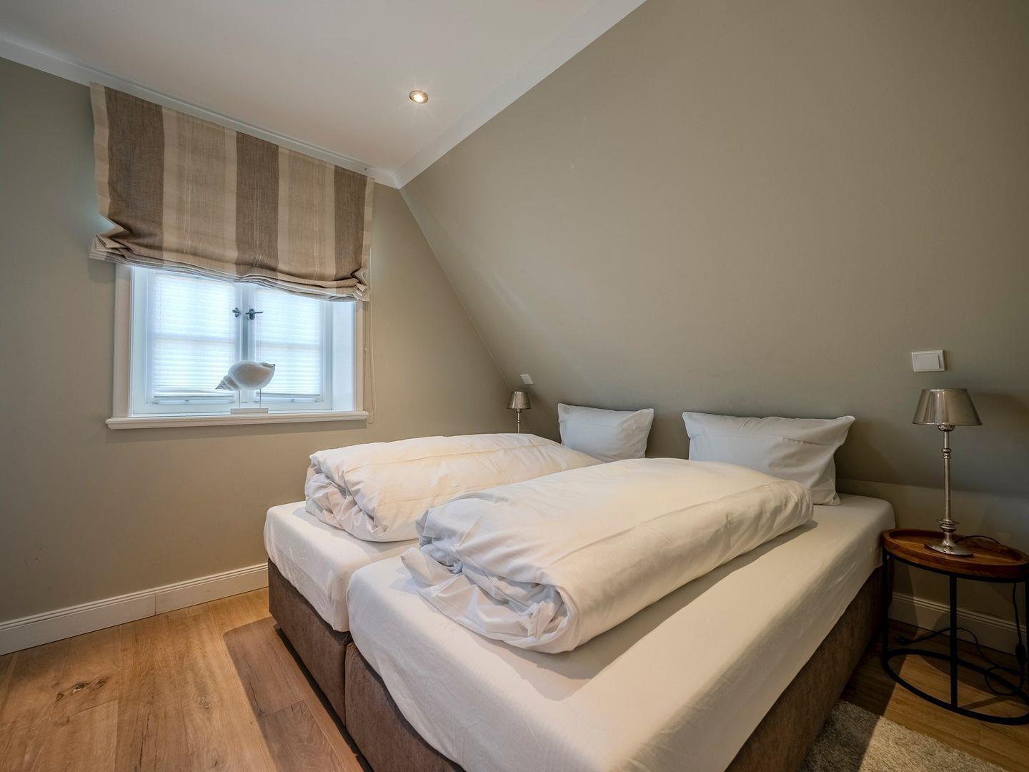 Im Obergeschoss erwartet Sie ein Doppelschlafraum mit Ankleide und Blick auf die Nordsee, ein Einzelzimmer mit Schreibtisch sowie ein geschmackvolles Duschbad. Das Dachgeschoss bietet einen weiteren Schreibtisch für kreatives Verweilen oder eventuelle Arbeiten. Im Untergeschoss befinden sich zwei gemütliche Doppelschlafräume und ein großzügiges Duschbad. Der Haushaltsraum ist mit Trockner und Waschmaschine ausgestattet. Ein PKW-Stellplatz direkt am Haus rundet das Angebot ab.