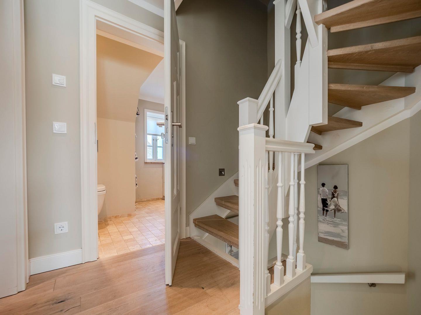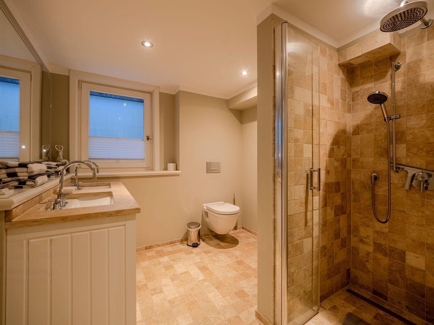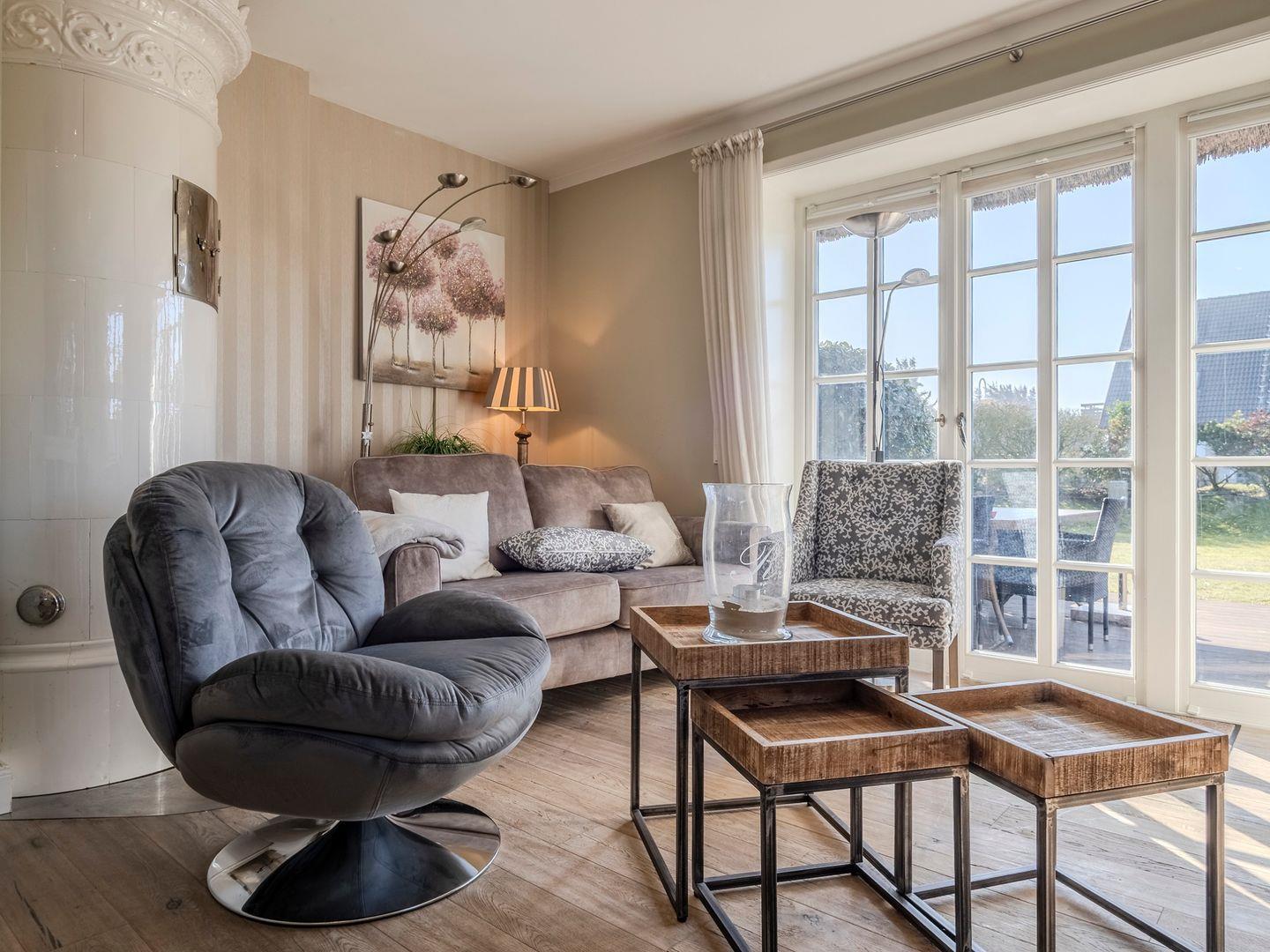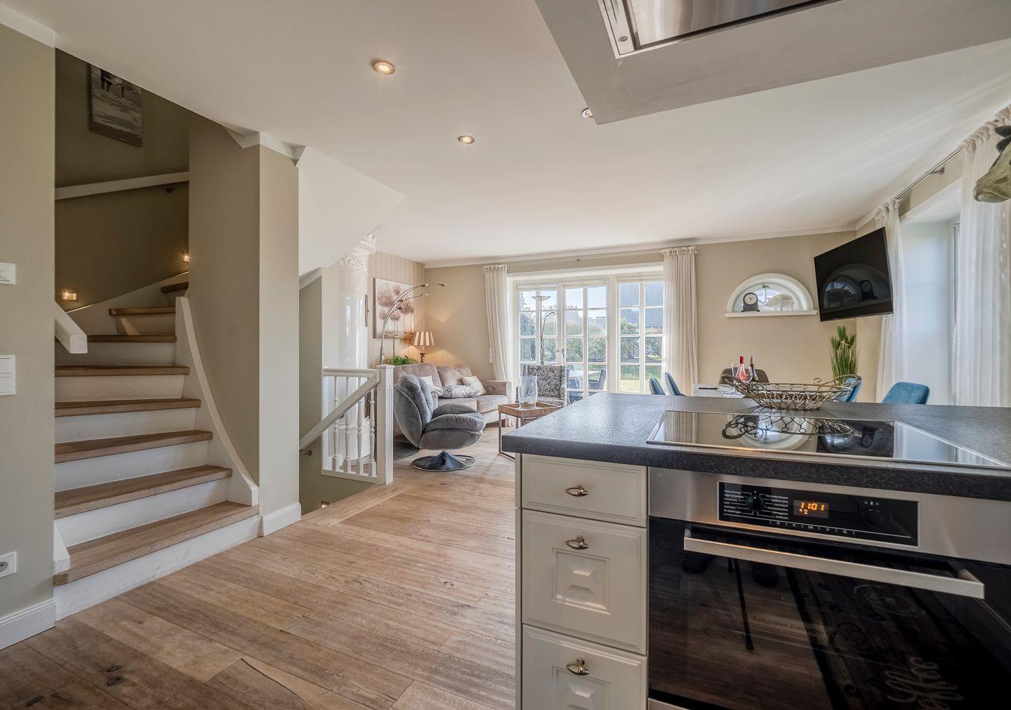 Herzlich willkommen im Komforthaus unter Reet mit 140 qm, nur 2 Gehminuten vom Strand entfernt. Hier können Sie das beruhigende Rauschen des Meeres hören und den Wellenschlag beinahe greifen. Dieses Haus ist ein wahres Juwel für alle Urlaubsliebhaber. Die moderne, vollausgestattete Küche bietet einen wundervollen Blick auf den Garten. Der großzügige Wohnraum, ausgestattet mit einem authentischen Friesenkachelofen, liegt direkt neben der Küche. Ein Gäste-WC und eine Garderobe im Windfang runden das Erdgeschoss ab.