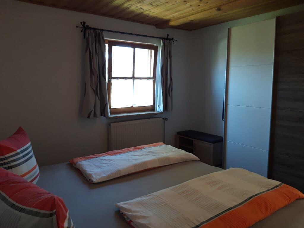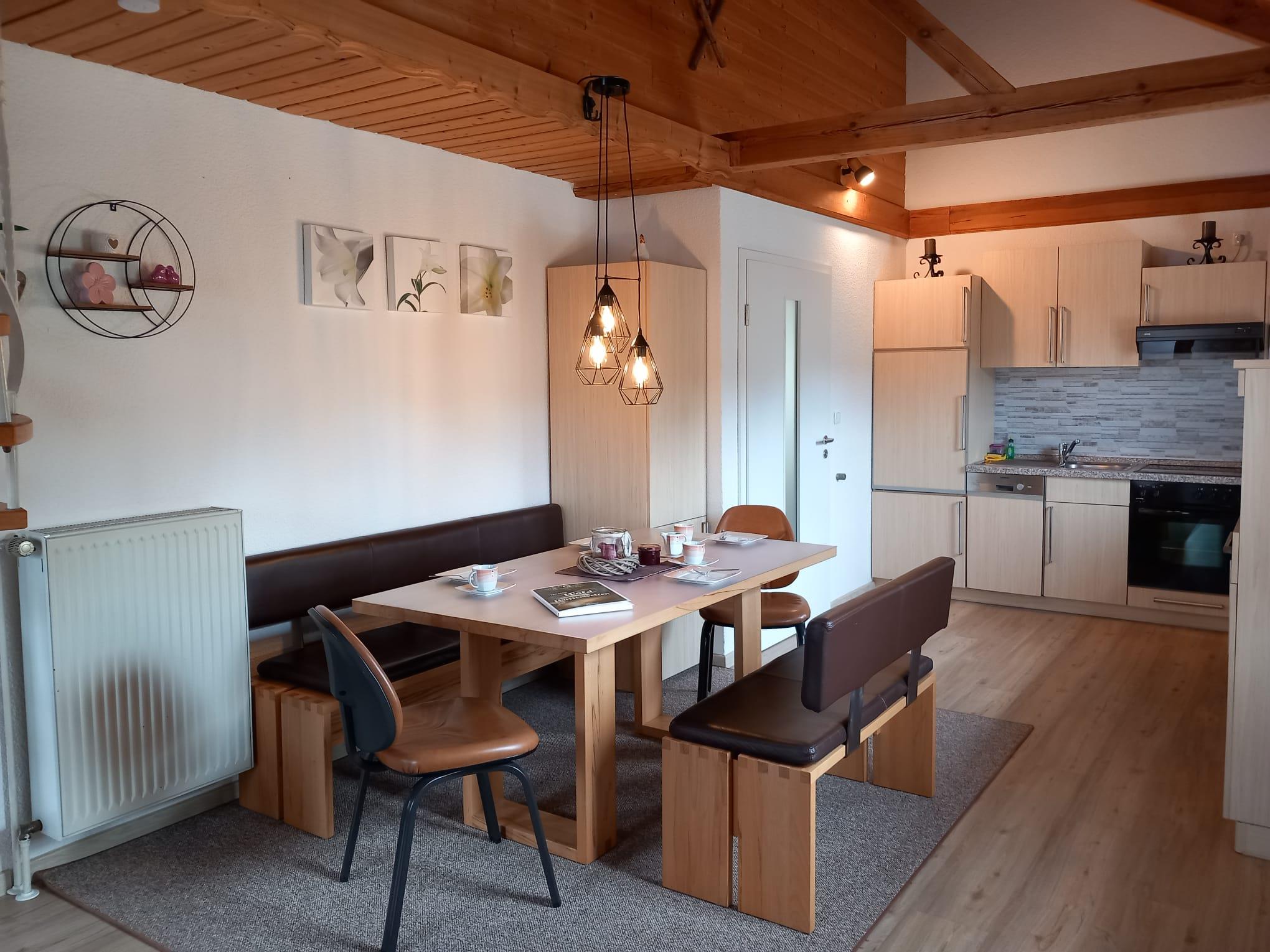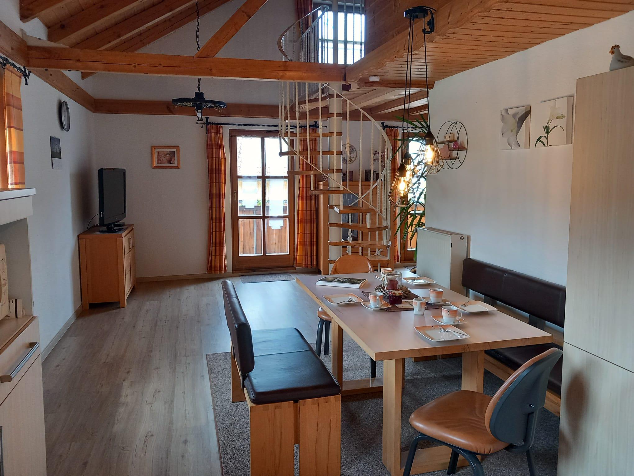 Ebenfalls im Erdgeschoss befindet sich das geräumige Wohnzimmer mit großem Flat-TV. Über die Wendeltreppe im Wohnraum gelangen Sie in das Dachgeschoss. Dort befindet sich eine Galerie mit ausziehbarer Schlafcouch und ein weiterer Schlafraum mit zwei Einzelbetten (je 1,40 x 2,00 m). Auf Anfrage kann gerne ein Kinderbett zur Verfügung gestellt werden.