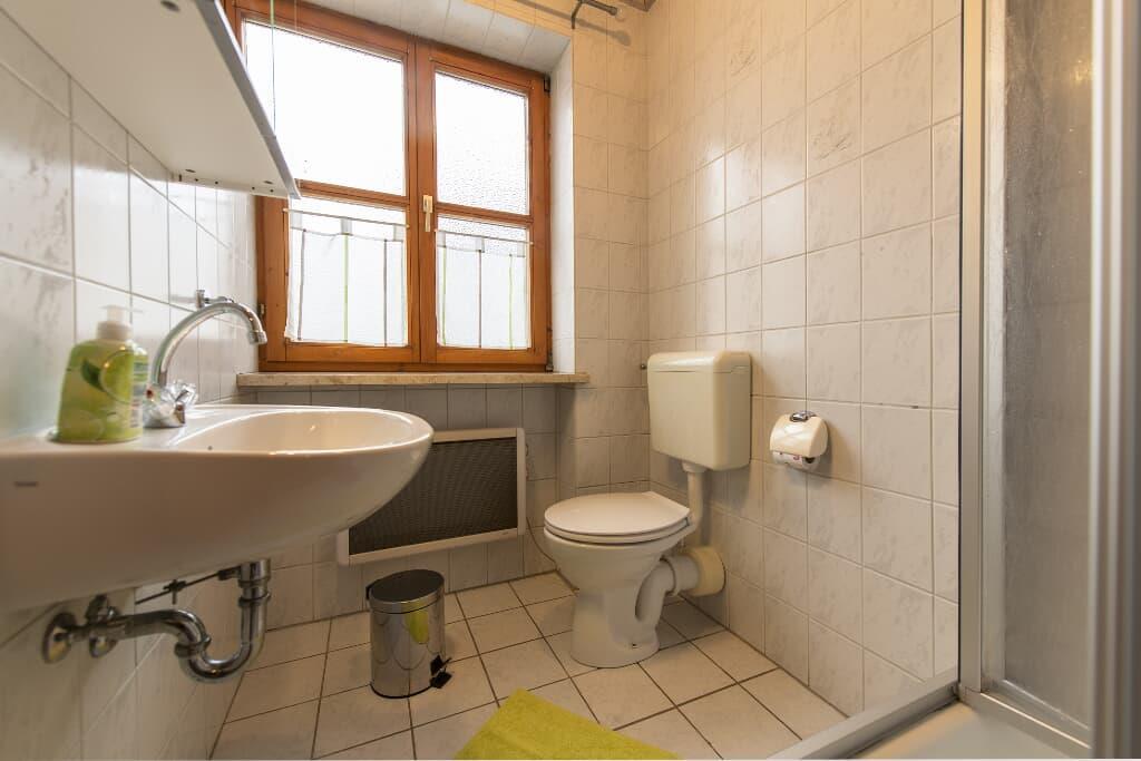Badezimmer mit Fenster, Waschbecken, WC und Dusche