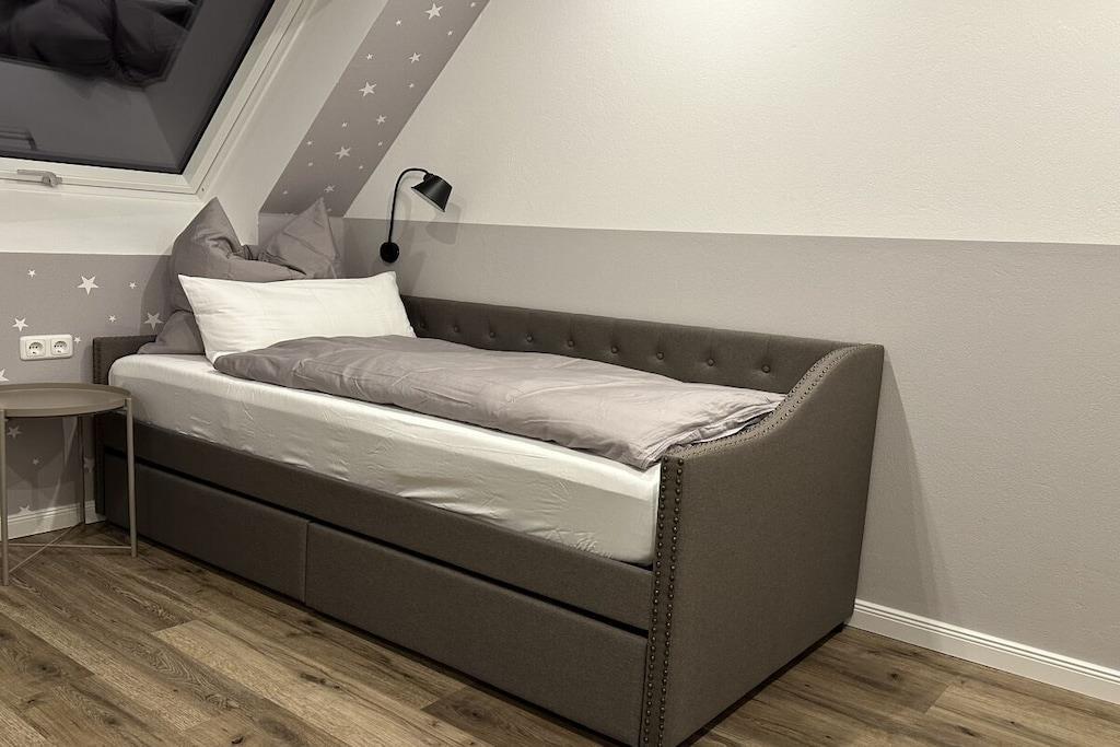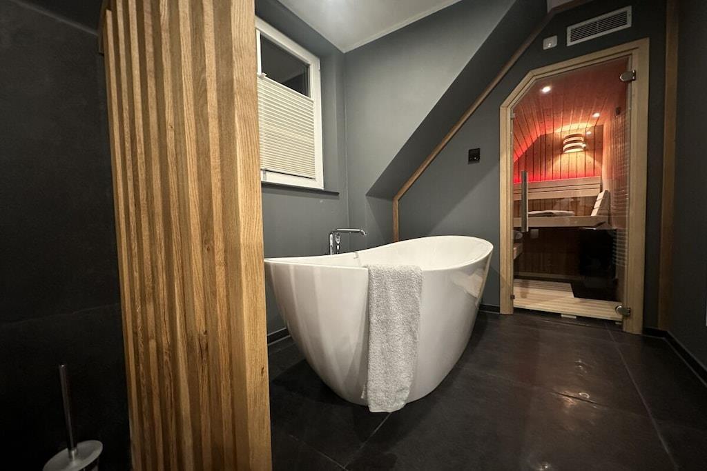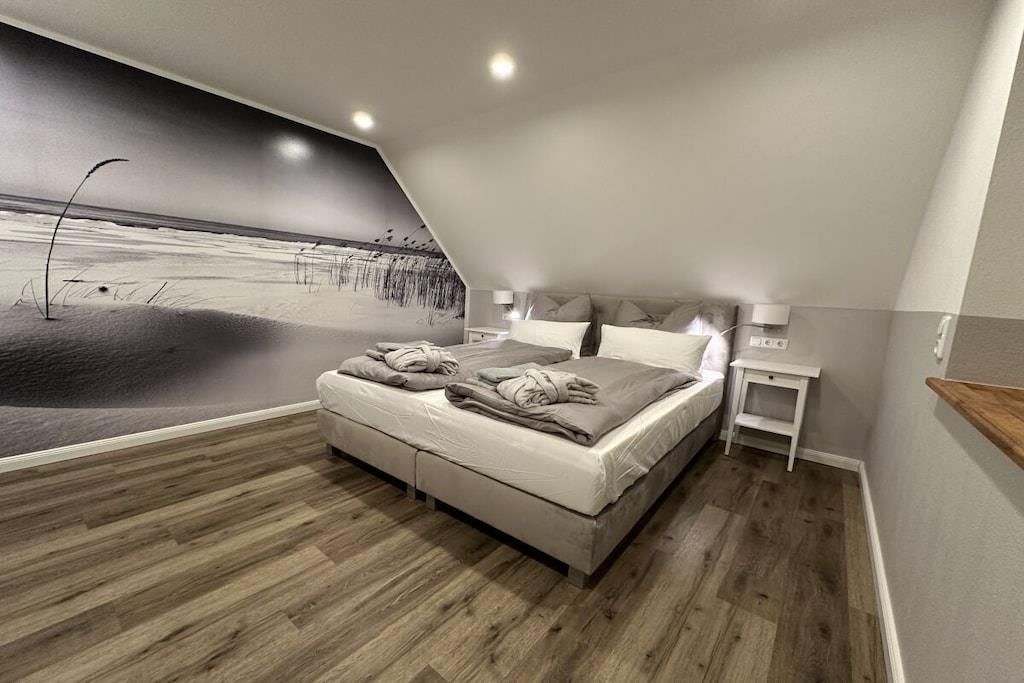 Willkommen in unseren Ferienhaus Eiderhuus in Tönning. Das Doppelhaus wurde im Jahr 2023 errichtet und mit liebevoller Hingabe eingerichtet, um Ihnen auf je 110 Quadratmetern Platz für 1-6 Personen einen unvergesslichen Urlaub nahe der Nordsee zu bieten. Der wunderbar lichtdurchflutete Wohnraum des Ferienhauses schafft eine behagliche Atmosphäre für gemeinsame Stunden mit Familie, dem Partner oder Freunden. Das einladende Sofa lädt zum Entspannen ein, der Esstisch bietet Platz für gesellige Mahlzeiten, und die voll ausgestattete Küche ermöglicht es Ihnen, kulinarische Köstlichkeiten zuzubereiten. Das „Eiderhuus“ heißt nicht nur Menschen herzlich willkommen, sondern auch Ihre vierbeinigen Begleiter, da Haustiere hier gerne gesehen sind. Die Weitläufigkeit des "Eiderhuus" zeigt sich ebenfalls im Außenbereich. Auf der großzügigen Terrasse mit dem dazugehörigen Garten erwartet Sie eine behagliche Sitzecke, ideal, um die letzten Sonnenstrahlen des Tages zu genießen. Ein vorhandener Grill lädt zu entspannten Abenden im Freien ein. Das Ferienhaus verfügt über insgesamt drei Schlafzimmer, jeweils ausgestattet mit einem hochwertigen Boxspringbett, sowie ein Zimmer mit zwei Einzelbetten. Im dritten Stock befinden sich zwei Einzelbetten, die idealerweise zu einem Doppelbett umgestaltet werden können. Bei uns finden Sie den erholsamen Schlaf, den Sie während Ihres Urlaubs an der Nordseeküste benötigen. Im Erdgeschoss befindet sich ein Badezimmer mit einer bodengleichen Dusche, während sich das zweite Badezimmer im ersten Stock mit einer Dusche und einer freistehenden Badewanne auszeichnet. Zusätzlich steht Ihnen eine großzügige Sauna zur Verfügung, um erholsame Stunden zu verbringen. Darüber hinaus haben Sie ab Ostern die Möglichkeit, optional das identische Ferienhaus Landhuus für eine Anreise mit 12 Personen zu buchen, sofern verfügbar. Bitte haben Sie Verständinis, dass bei einer Buchung unter 5 Tagen Zusatzkosten anfallen können. In Tönning wird eine Kurabgabe erhoben. Die Kurabgabe beträgt je Tag in der Zeit vom 15. Mai bis 30. September 2,20 EURO In der Zeit vom 01. April bis 14. Mai beträgt die Kurabgabe 0,90 EURO am Tag. Ermäßigungen für die Kurabgabe: Schüler und Auszubildende, die das 18. Lebensjahr vollendet haben, zahlen 0,90 EURO. Für Schwerbehinderte, die eine Behinderung von 50 % und mehr nachweisen, wird die Kurabgabe auf 50 % ermäßigt. Dies gilt auch für die erforderliche Begleitperson.