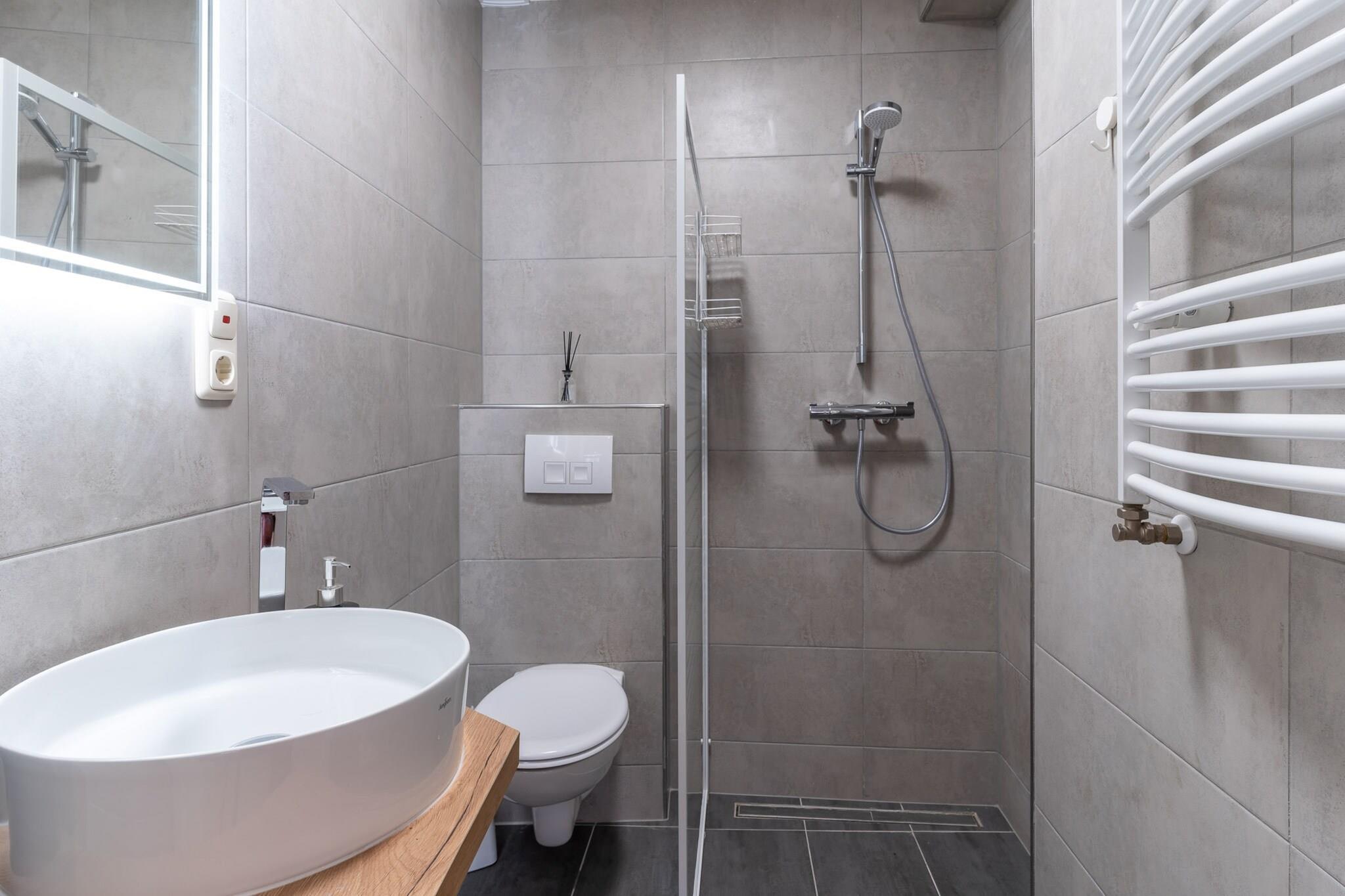 Stueetage: (Køkken(spisebord, kogeplade(Komfur med fire kogeplader, glaskeramisk), elkedel, brødrister, emhætte, kaffemaskine, ovn, køleskab), soveværelse(dobbeltseng, Fjernsyn), badeværelse(bruser(Walk-in-bruser), håndvask, toilet, føntørrer)) parkering, Vaskeripakke inkl.