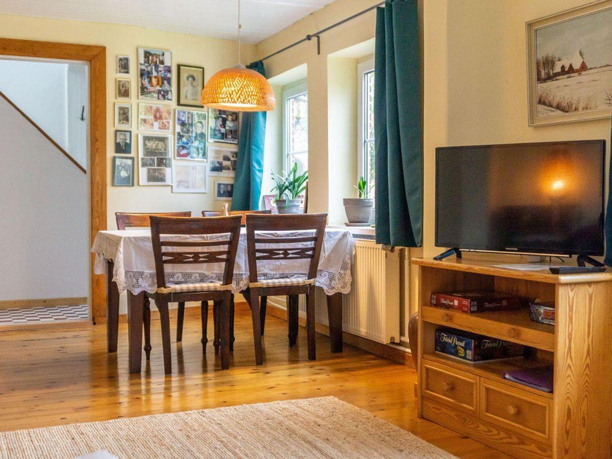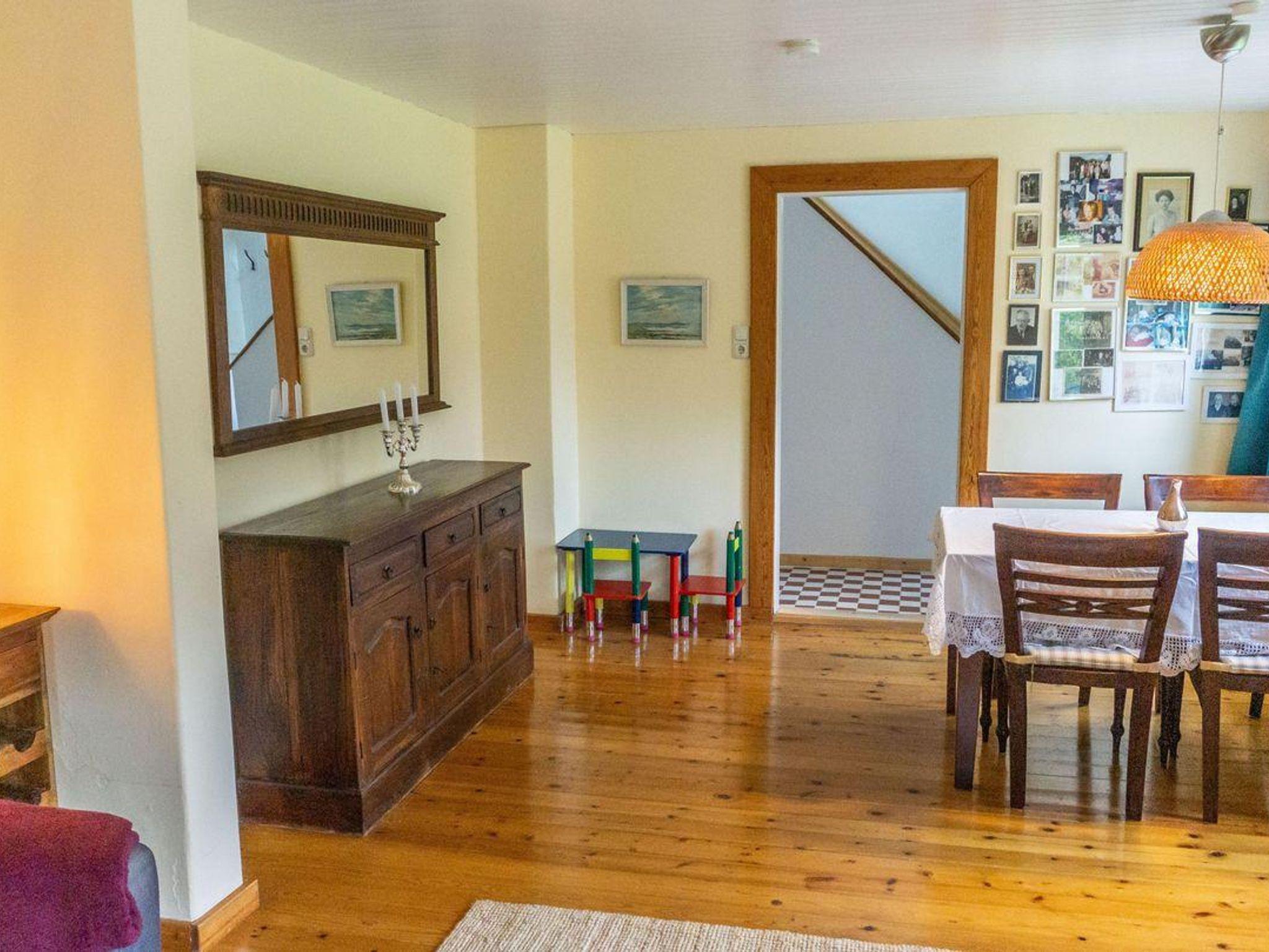 Im Erdgeschoss erwartet Sie ein großzügiger Wohnbereich mit Dielenboden, Sofaecke und moderner Unterhaltungselektronik, darunter ein Fernseher (35–44 Zoll, Satelliten-TV), CD-Spieler und Radio.