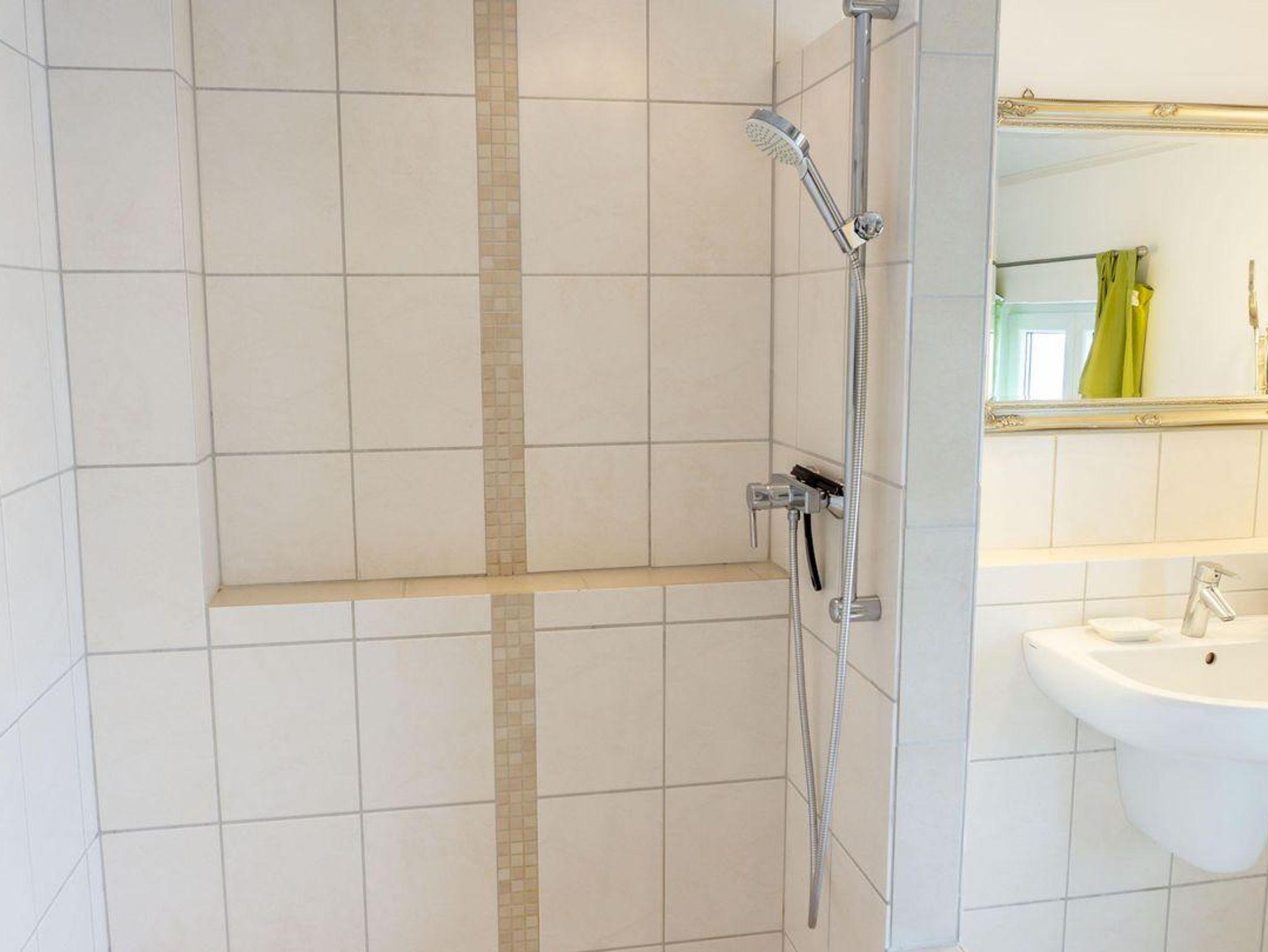 Das Badezimmer im Erdgeschoß ist funktional gestaltet und verfügt über eine bodengleiche Dusche, WC, Waschbecken, Haartrockner, Kosmetikspiegel und Fenster. Hier finden Sie außerdem eine Waschmaschine zur Eigennutzung.