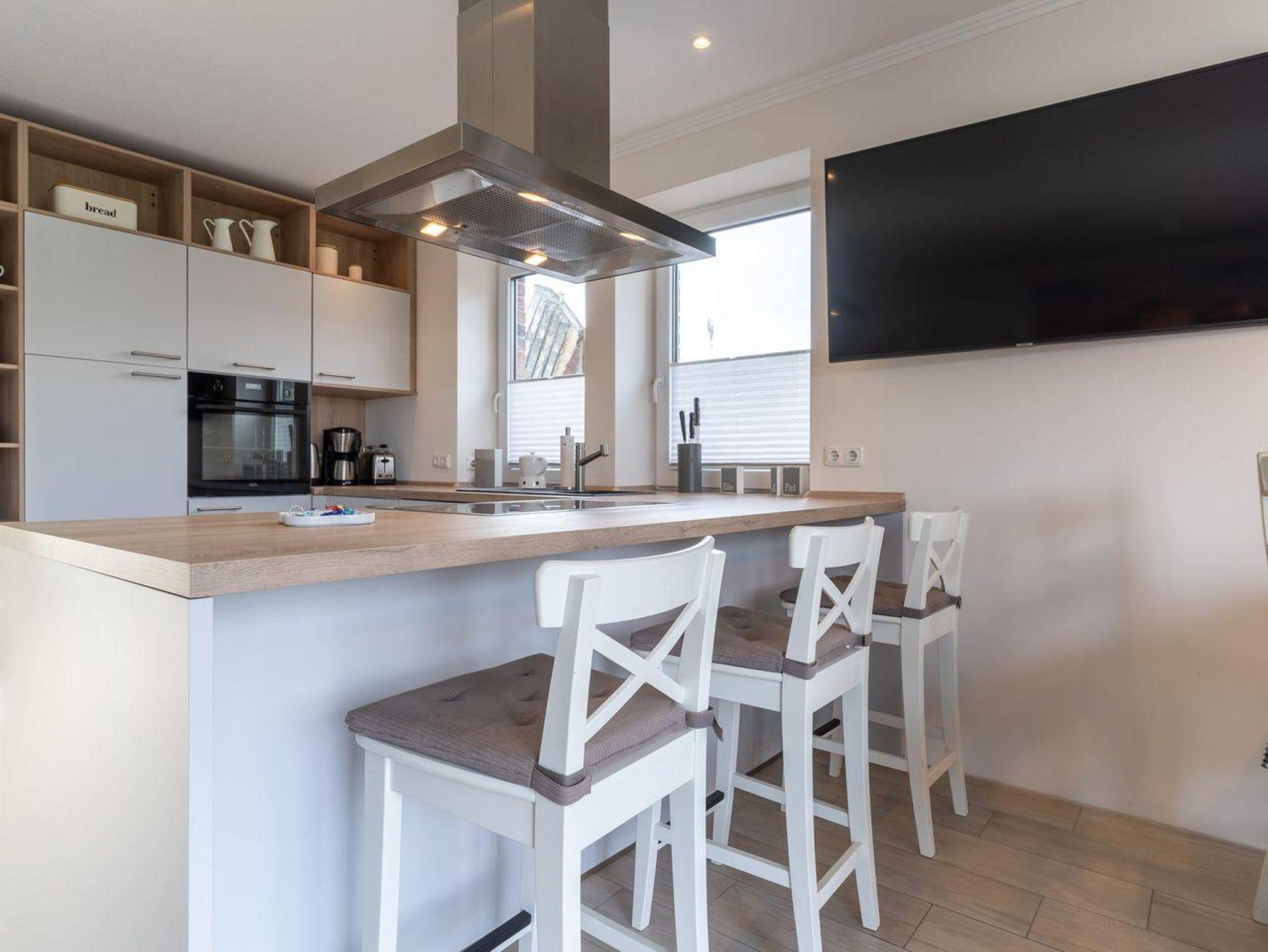Die moderne Einrichtung des Ferienhauses umfasst alle Annehmlichkeiten, die Sie sich wünschen können. Eine eigene Sauna erwartet Sie, um Körper und Geist zu verwöhnen, während der Ofen an kühleren Abenden eine behagliche Atmosphäre schafft. Die gemütlichen Schlafzimmer bieten nicht nur erholsame Nächte, sondern auch beeindruckende Ausblicke auf den Hafen und die Eider. Die großzügige und moderne Wohnküche lädt zum gemeinsamen Kochen und Genießen ein.