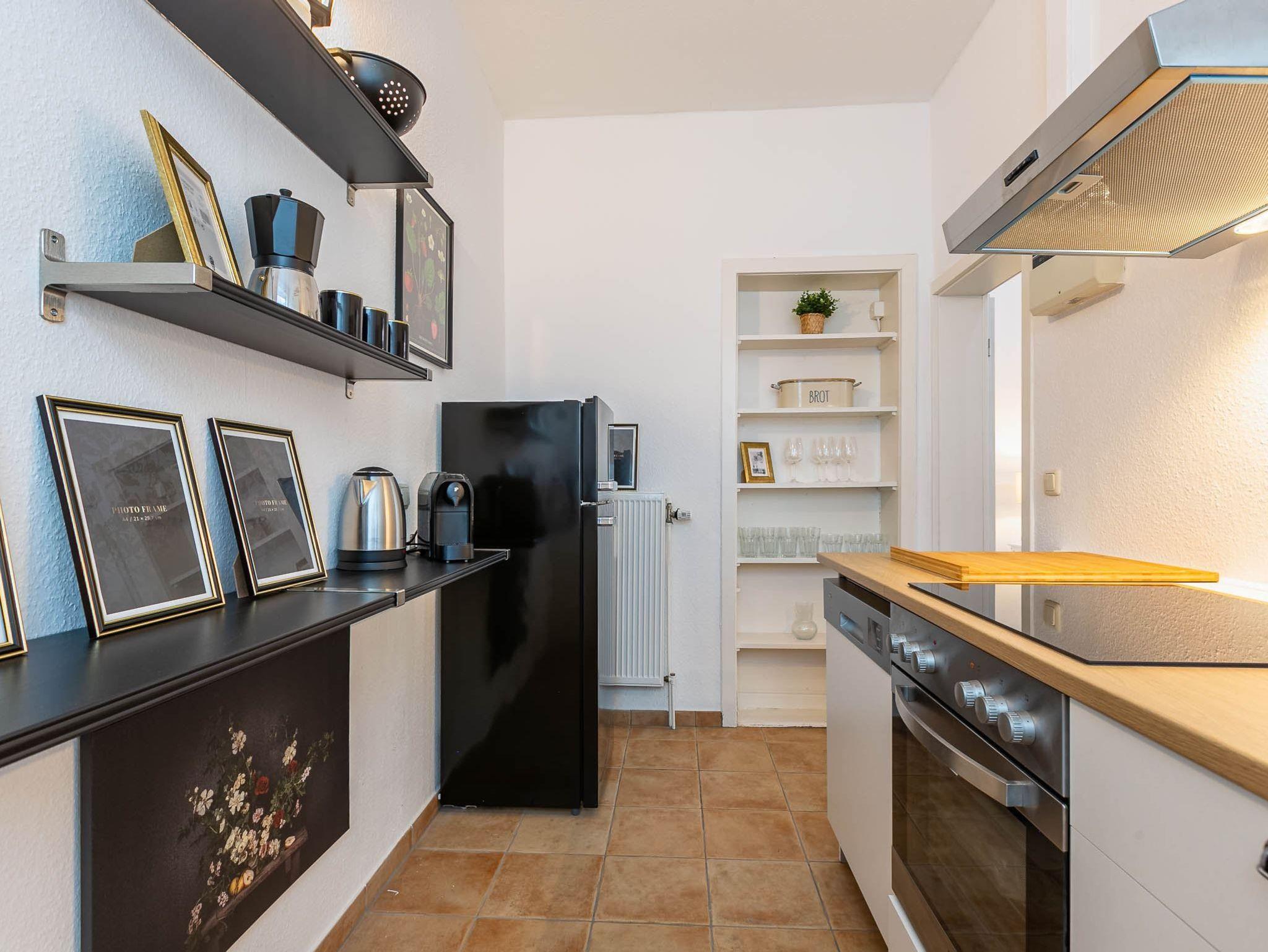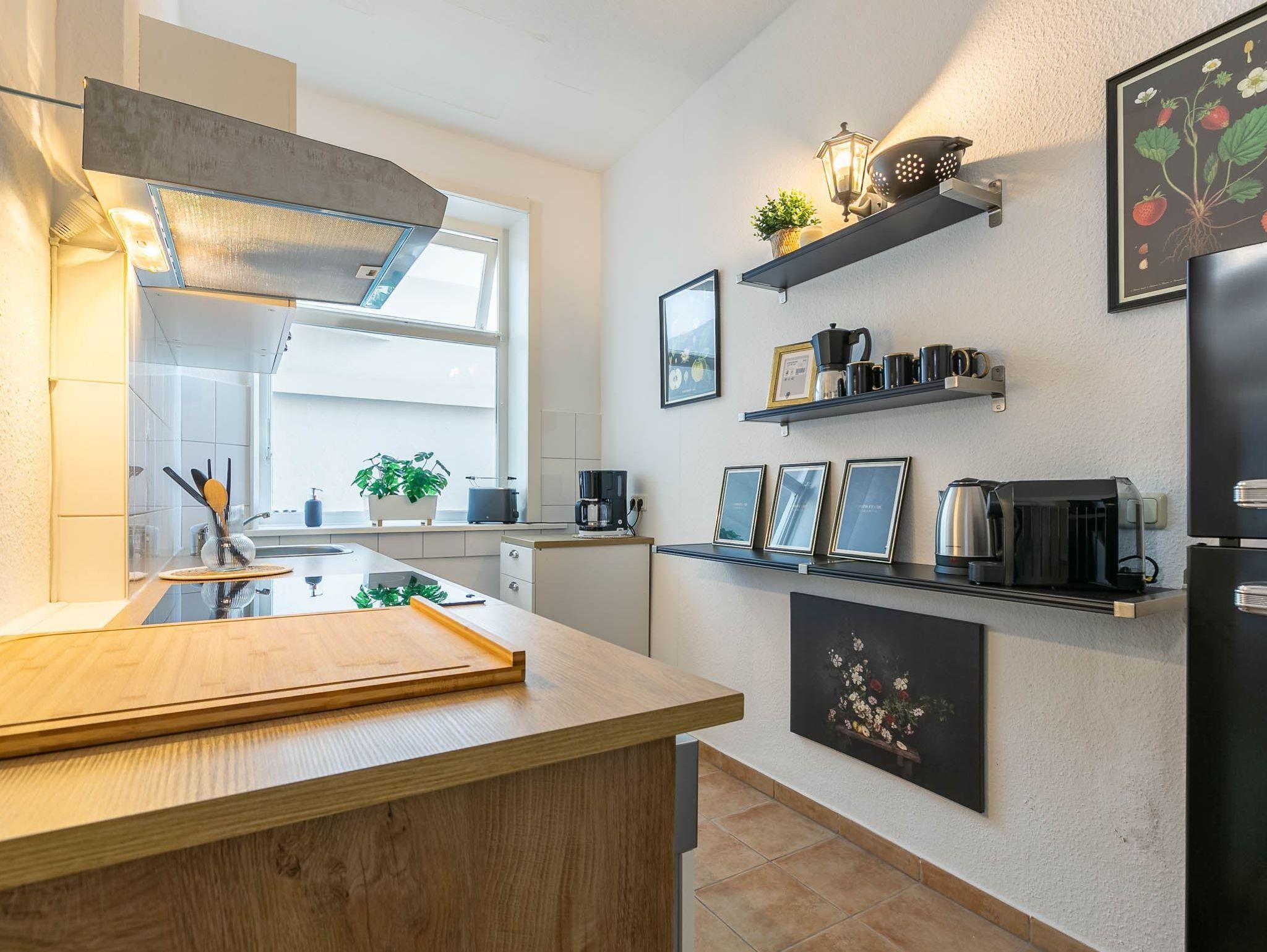 Separate Küche mit Backofen, Mikrowelle, Geschirrspüler, Kühl-Gefrier-Kombi und Nespresso Kapsel-Kaffeemaschine.