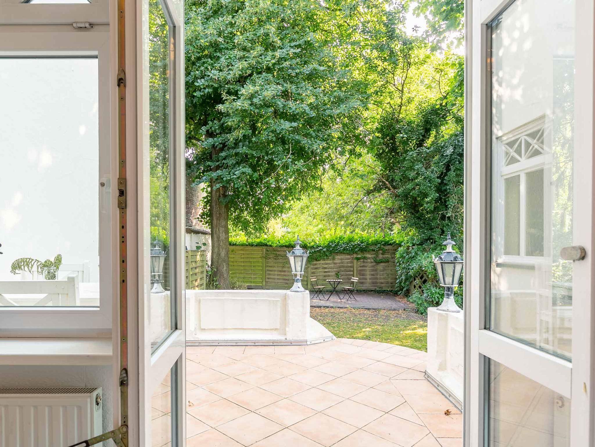 1. Schlafzimmer mit Doppelbett (2x 90x200cm) Kommode, Garderobe, Sessel und Hocker. Direkter Zugang zur möblierten Gartenterrasse nach Süden. Dieses Schlafzimmer ist durch eine Schiebetür vom Wohnzimmer abgeteilt.