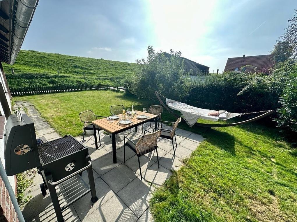 Zur Ferienwohnung gehört eine Terrasse mit Deichblick und Abendsonne, ausgestattet mit Gartenmöbeln, Sonnenschirm und Grill und ein ausschließlich von den Gästen der Ferienwohnung Deck 1 genutzter eingezäunter Garten, der gerne ausgiebig für Federball-Turniere, Croquet-Weltmeisterschaften und unendliches Stöckchenwerfen mit euren Fellnasen genutzt werden darf. Hinter dem Grundstück fließt ein kleiner Bach. Zur Wohnung gehören zwei eigene Parkplätze.