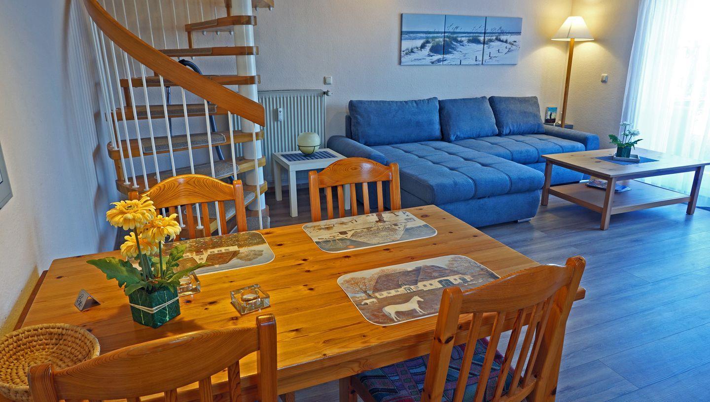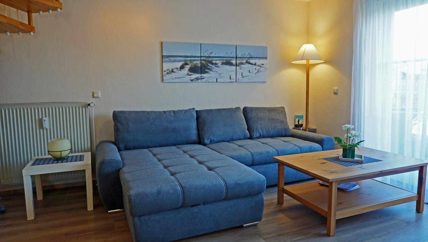 Der offene Wohnbereich mit Schlafsofa ist harmonisch in die Küche integriert und lädt mit einem gemütlichen Sofa, einem Sessel und einem TV zum Entspannen ein. Am Esstisch können Sie gemeinsam Ihre Mahlzeiten genießen. Die kompakte Küche ist mit allem ausgestattet, was Sie für die Zubereitung Ihrer Lieblingsspeisen benötigen. Für die Morgenstunden steht eine Kaffeefiltermaschine bereit. Ein Gefrierfach gibt es im Kühlschrank.