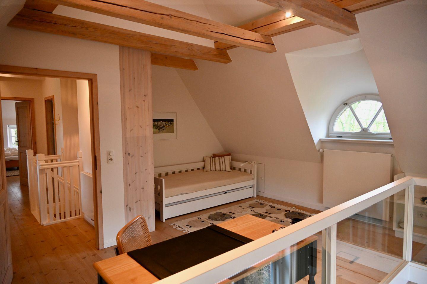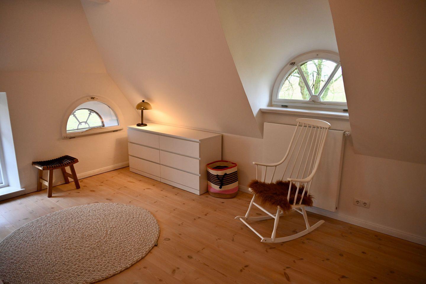 Das Ferienhaus verfügt über vier Zimmer, darunter drei gemütliche Schlafzimmer: Eins mit komfortablen Doppelbett (180x200) im OG, eins mit offener Galerie und 2 Einzelbetten (90x200) im OG und eines mit zwei Einzelbetten (90x200) im EG – ideal für Kinder oder Freunde. Zwei moderne Bäder sorgen für den nötigen Komfort: ein Duschbad im Erdgeschoss und ein großzügiges Vollbad im Obergeschoss, perfekt für eine entspannte Auszeit nach einem Tag am Meer.