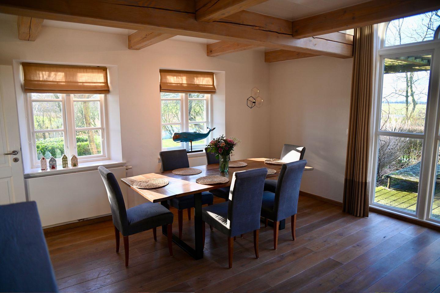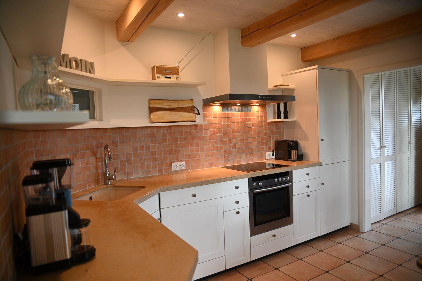Die voll ausgestattete Küche lässt keine Wünsche offen. Ob Sie eine Kleinigkeit zubereiten oder ein Festmahl für die Familie zaubern möchten – mit Spülmaschine, großem Kühlschrank mit Gefrierfach, Nespresso-Kaffeemaschine, Kaffeefiltermaschine und vielem mehr steht Ihnen alles zur Verfügung. Der angrenzende Essbereich mit Panoramafenster bietet einen fantastischen Blick in die Natur und lädt zu ausgedehnten Mahlzeiten und gemütlichen Abenden ein. Für die kühleren Tage steht Ihnen ein Kaminofen zur Verfügung.