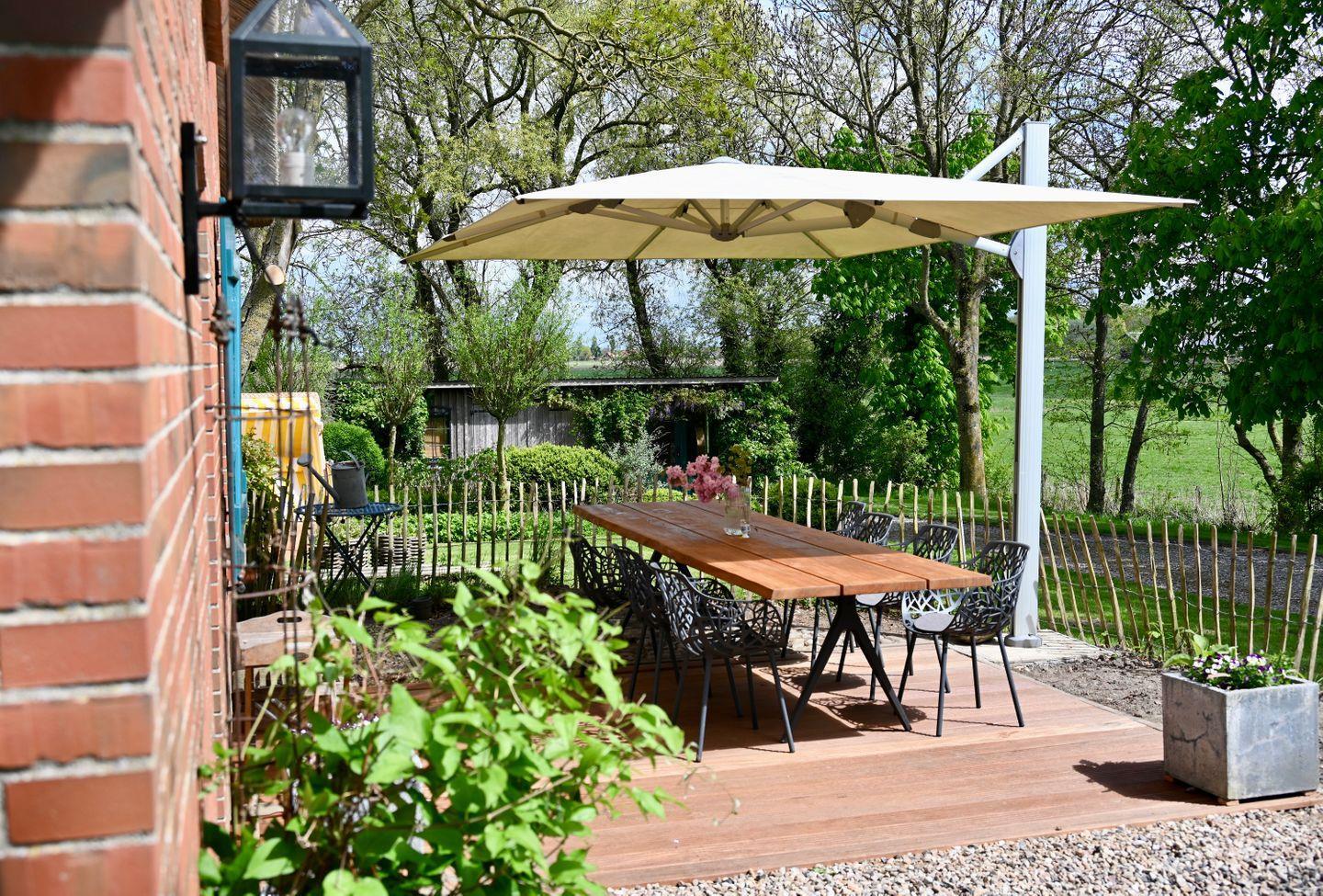 Der großzügige Außenbereich auf einem 3900 m² großen Grundstück lässt keine Wünsche offen. Zwei Sonnenterrassen, ausgestattet mit bequemen Sonnenliegen und einem traditionellen Strandkorb, laden zum Sonnenbaden und Entspannen ein. Der weitläufige Garten bietet außerdem Platz für Aktivitäten wie Tischtennis oder Spielen mit den Kindern. Für Hundebesitzer gibt es viel Raum, um den Vierbeiner toben zu lassen.