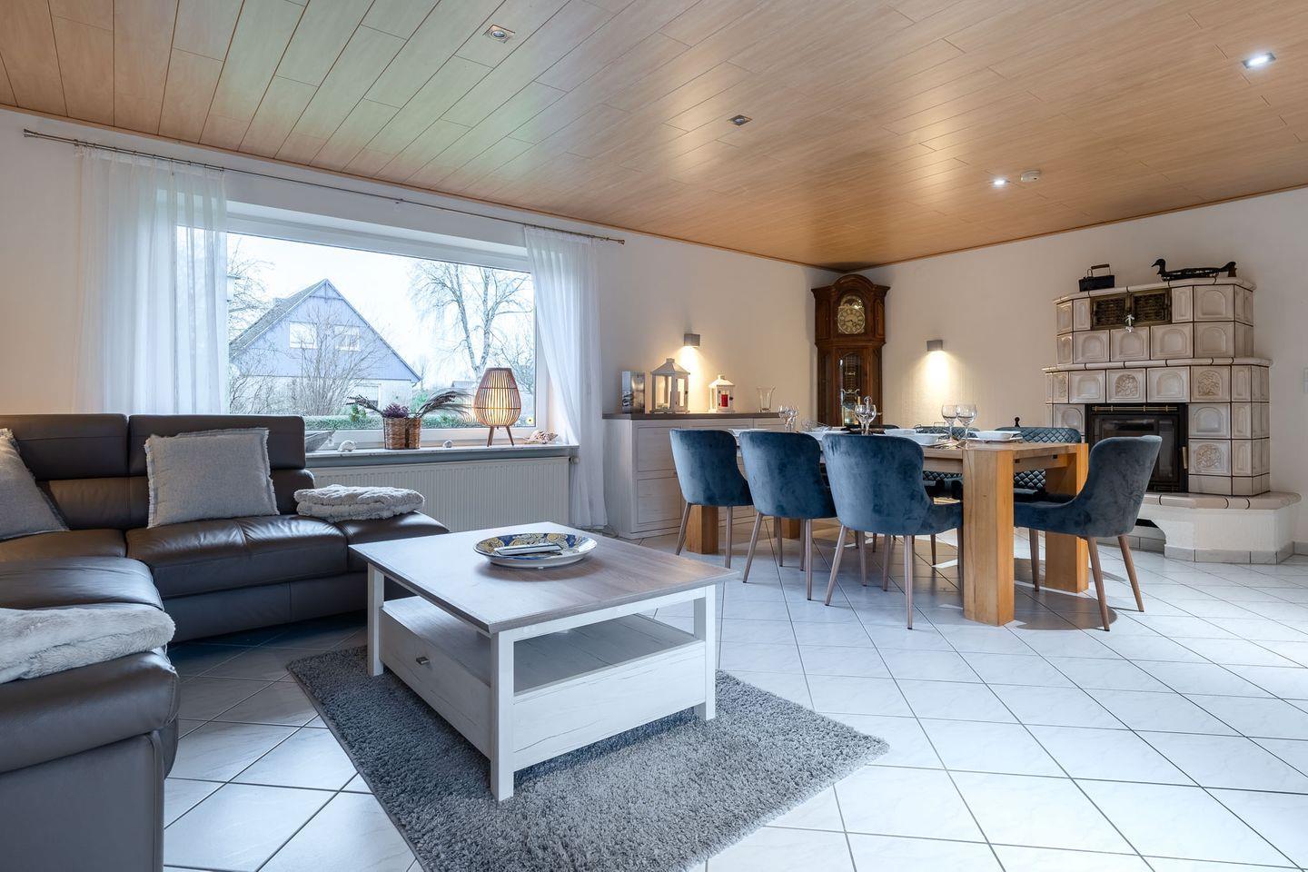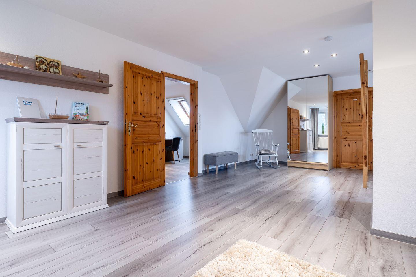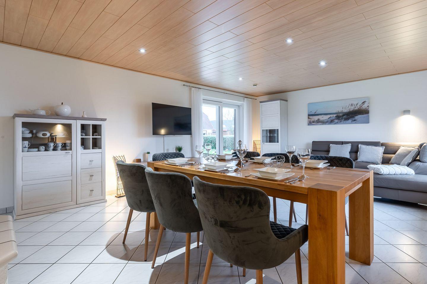 Die Ferienwohnung überzeugt mit einer modernen und gemütlichen Einrichtung. Der offene Wohnbereich lädt zum Verweilen ein, während die gut ausgestattete Küche das Herz jedes Hobbykochs höherschlagen lässt. Genießen Sie gemeinsame Mahlzeiten im großzügigen Essbereich oder entspannen Sie nach einem Tag an der Nordsee in der gemütlichen Sitzecke.