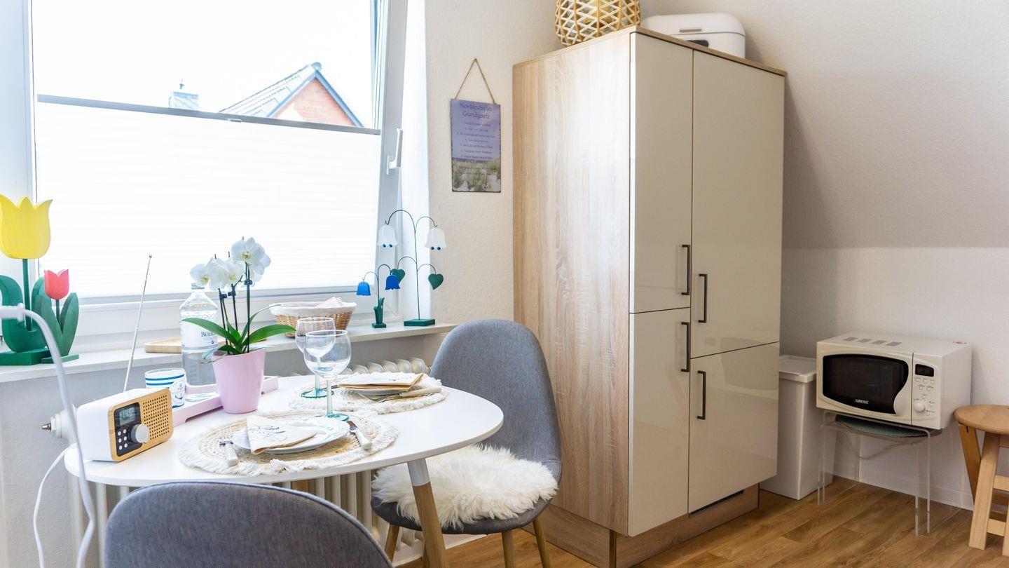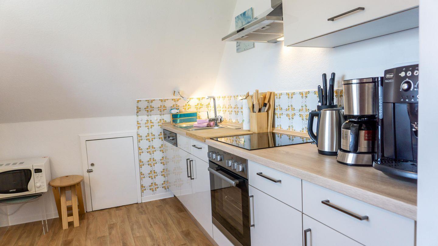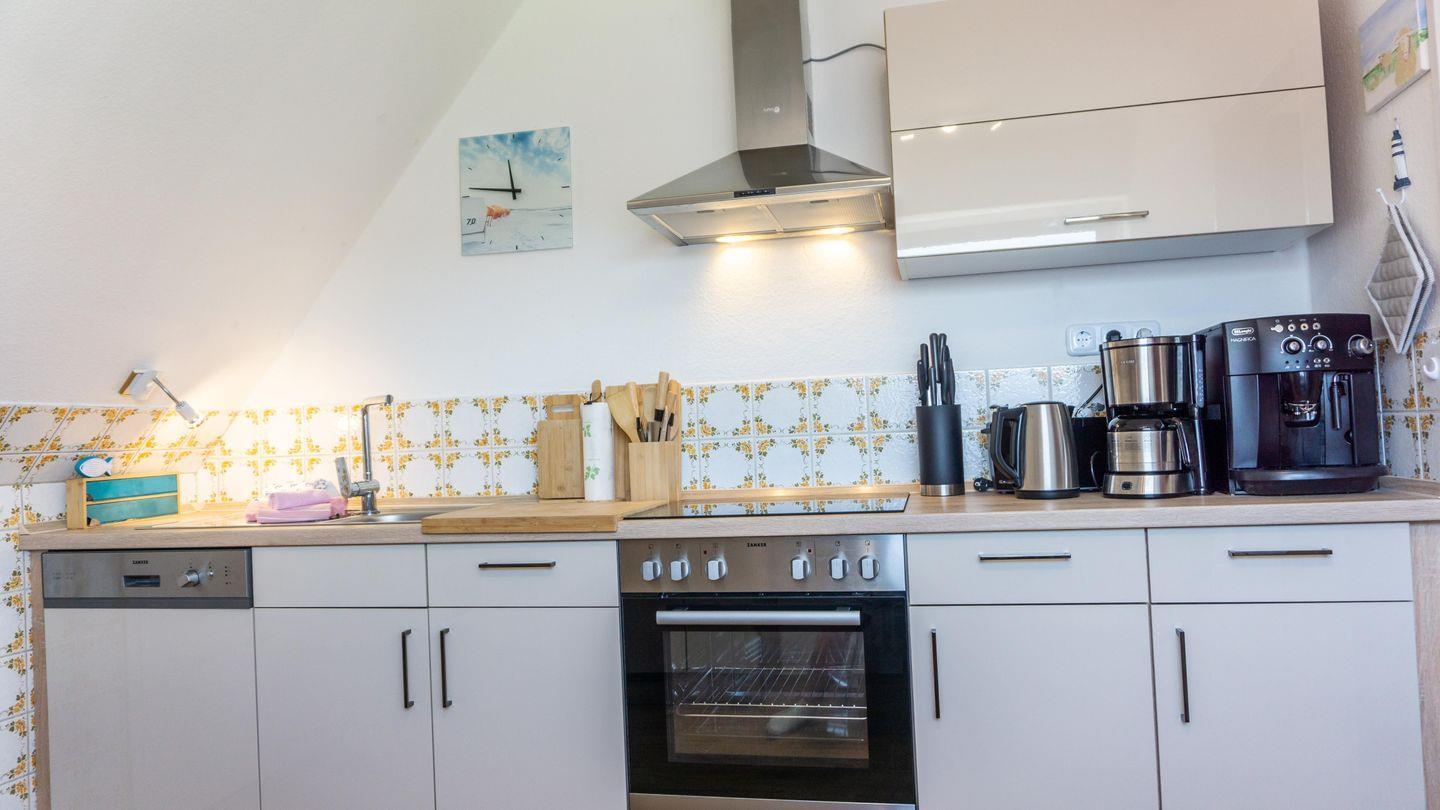 Im offen gestalteten, geschlossenen Küchenbereich mit Esstisch erwartet Sie eine hochwertige Küchenausstattung: Herd, Backofen, Mikrowelle, Kühlschrank mit Gefrierfach, Geschirrspüler, Kaffeemaschine und Automat, Wasserkocher, Toaster, Mixer sowie umfangreiches Koch- und Essgeschirr lassen keine Wünsche offen und machen die Selbstversorgung einfach. Ein Essbereich lädt zum gemeinsamen Speisen ein.