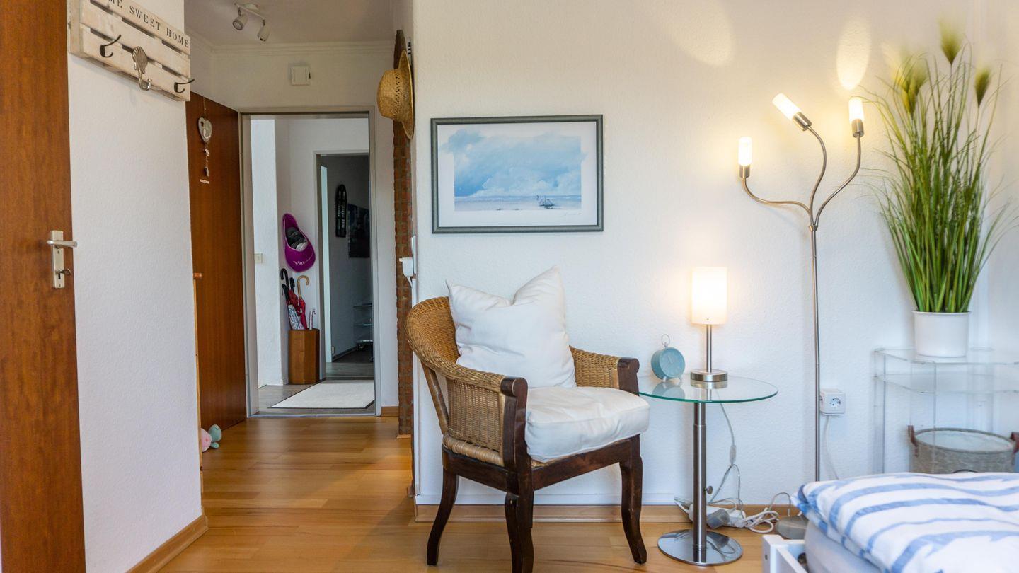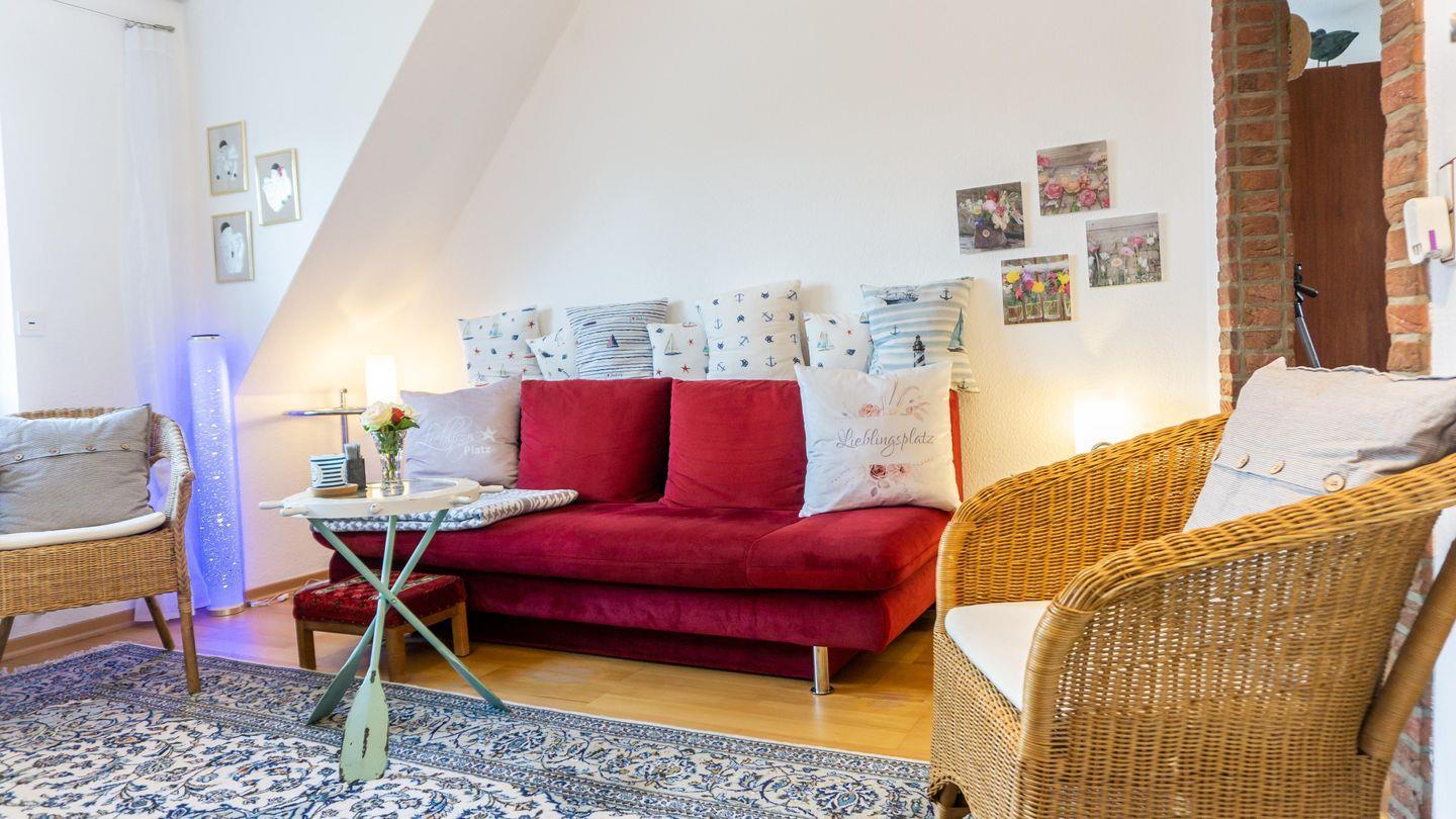 Insgesamt können 4 Gäste komfortabel untergebracht werden. Das Wohnzimmer ist gemütlich gestaltet und bietet eine Sofaecke, Sessel und moderne Unterhaltungselektronik wie einen Fernseher und ein Radio.