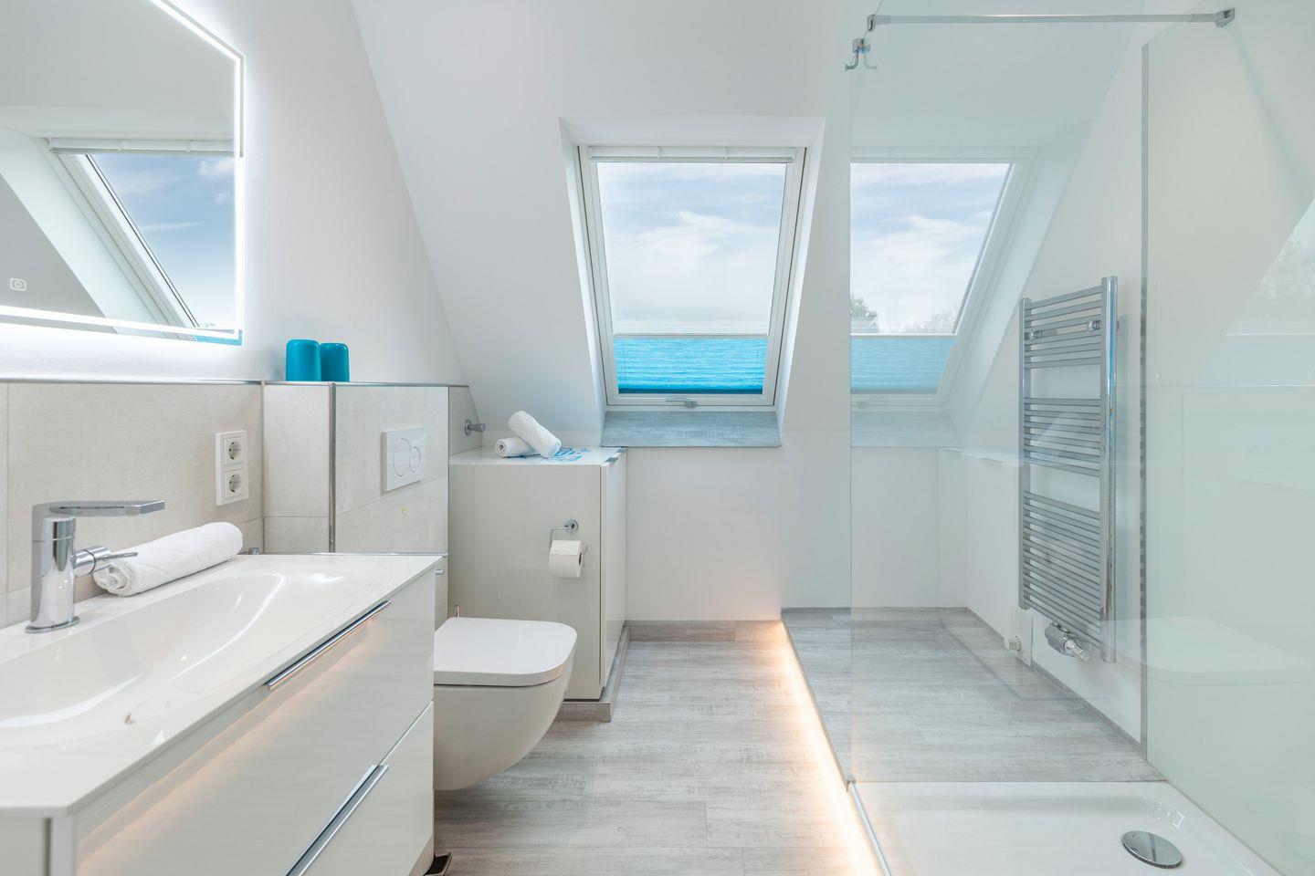 Das Badezimmer (1. OG) ist hell und modern gestaltet und verfügt über eine Dusche, WC, Waschtisch, Kosmetikspiegel und ein Fenster, das für angenehmes Tageslicht sorgt. Ein zusätzliches Gäste-WC erhöht den Komfort für Familien und kleine Gruppen. Fußbodenheizung und Öl-Heizung schaffen ein angenehmes Raumklima, während Waschmaschine, Trockner, Bügeleisen, Bügelbrett und ein Wäscheständer den Alltag während des Aufenthalts erleichtern. Sichtschutz an allen Fenstern sowie ein Ganzkörperspiegel runden den Komfort ab.