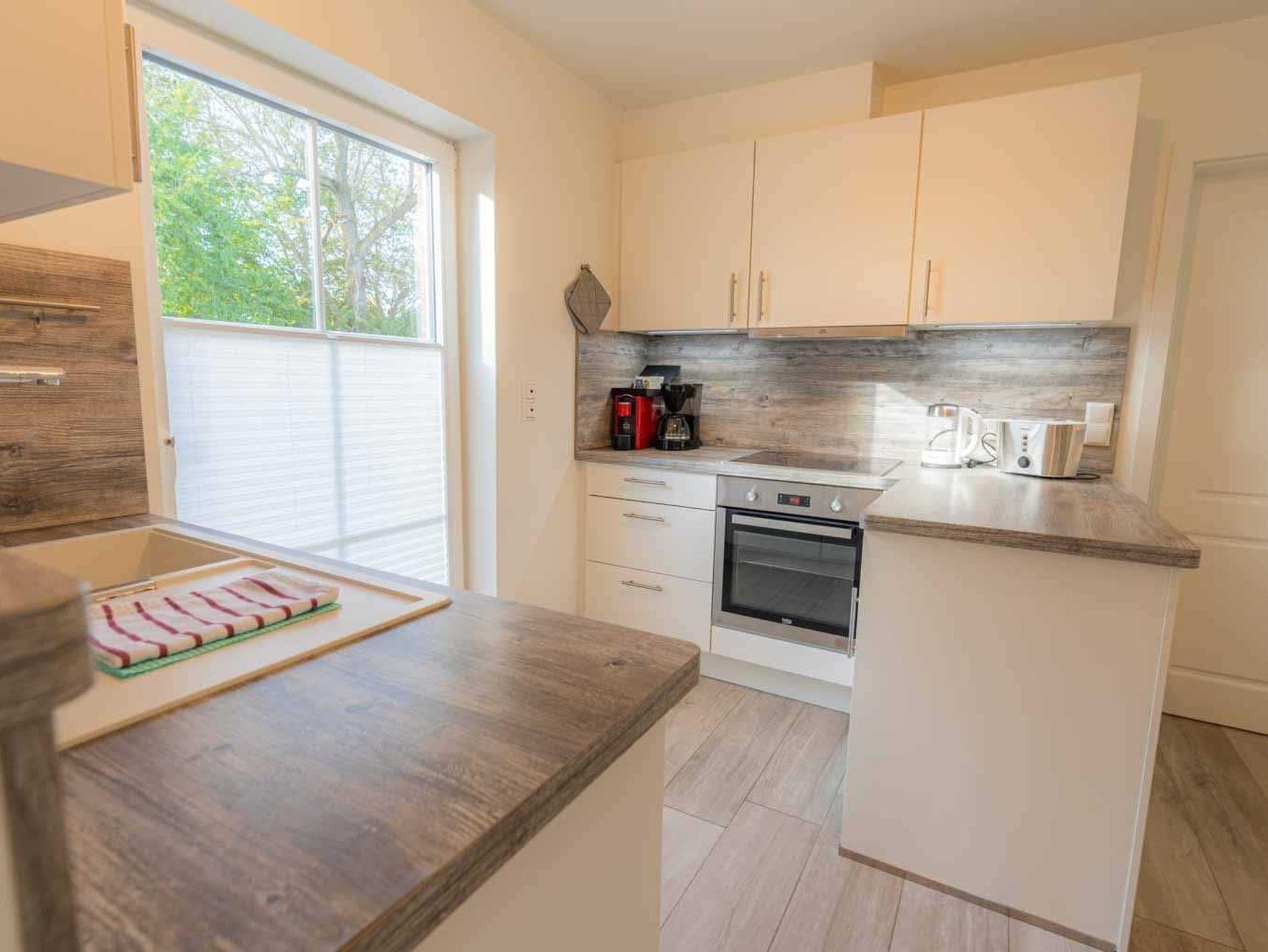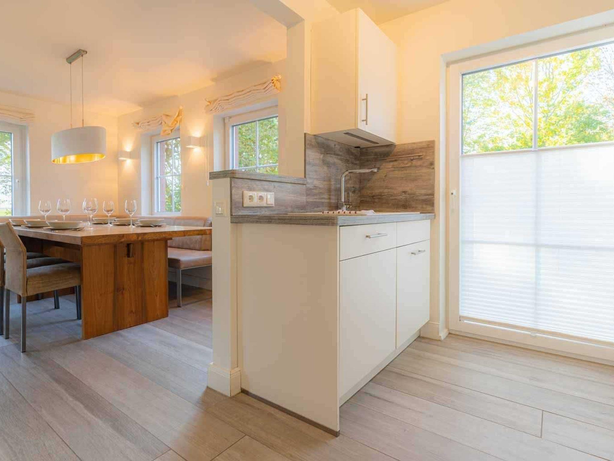 Halboffene Küche mit Backofen, Geschirrspüler, Kühlschrank mit Gefrierfach und Waschtrockner. Abstellraum mit Staubsauger. Direkter Zugang zur möblierten Garten-Terrasse nach Westen.