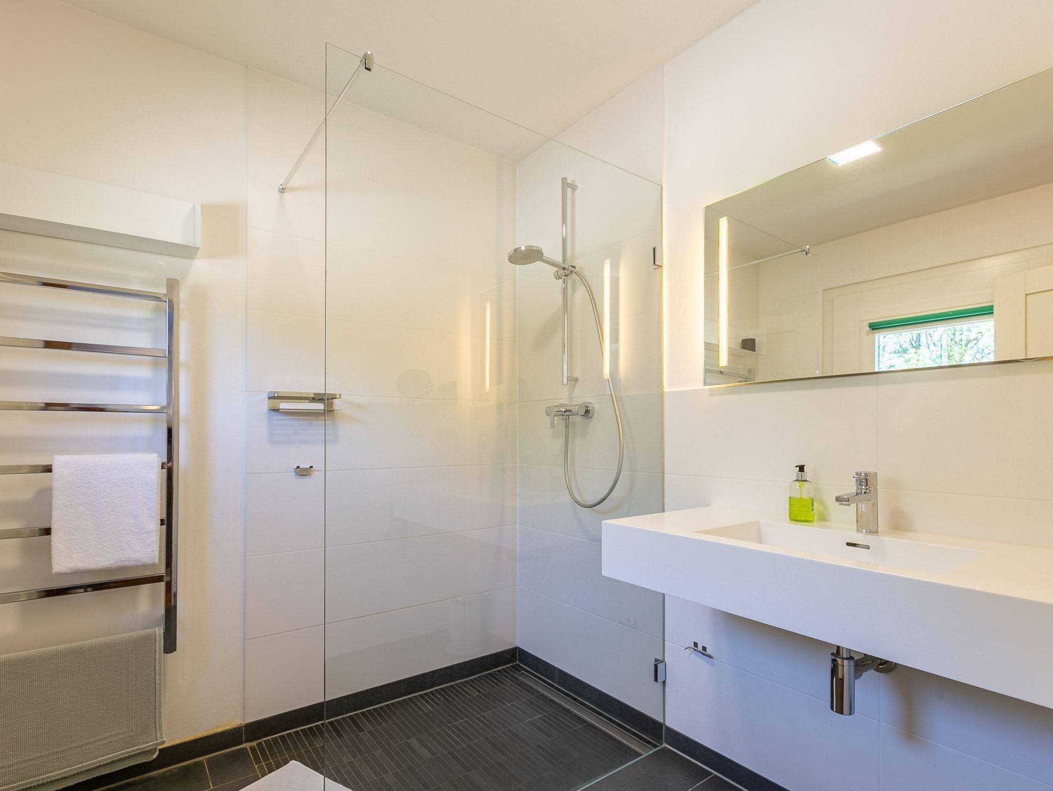 Badezimmer (Duschbad) mit bodengleicher Dusche, Tageslicht und Föhn. Separates WC.
