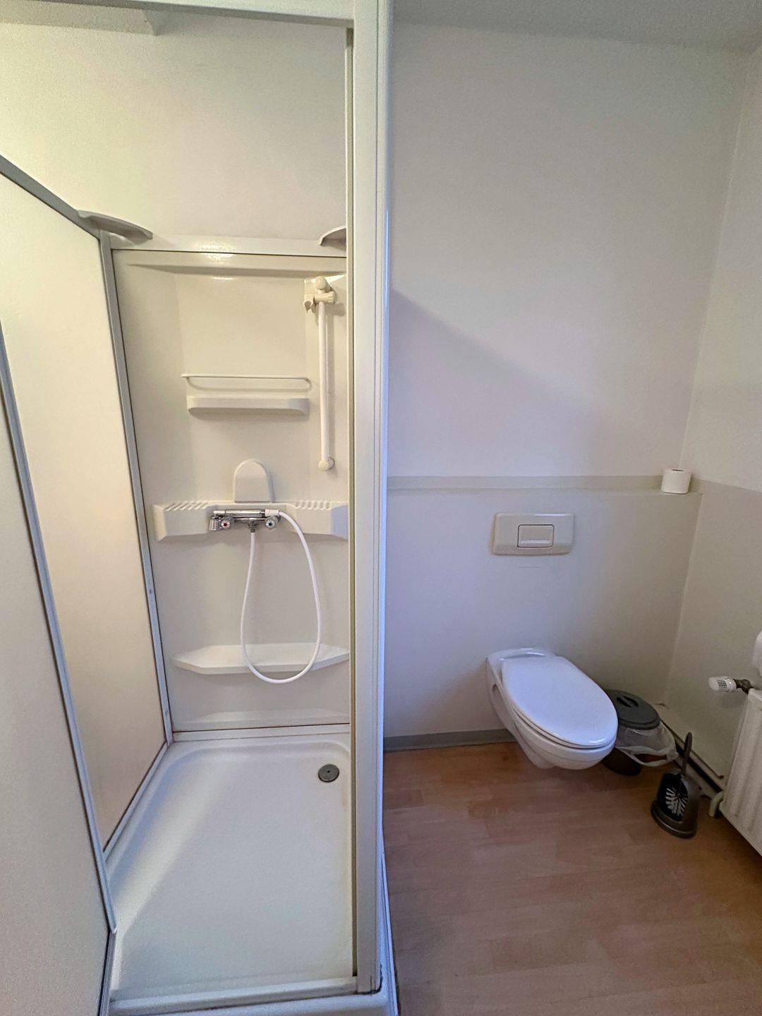 Schreibtisch mit 1 Stuhl und 1 Sessel. Das Badezimmer hat Waschbecken, WC, Dusche sowie Haartrockner.