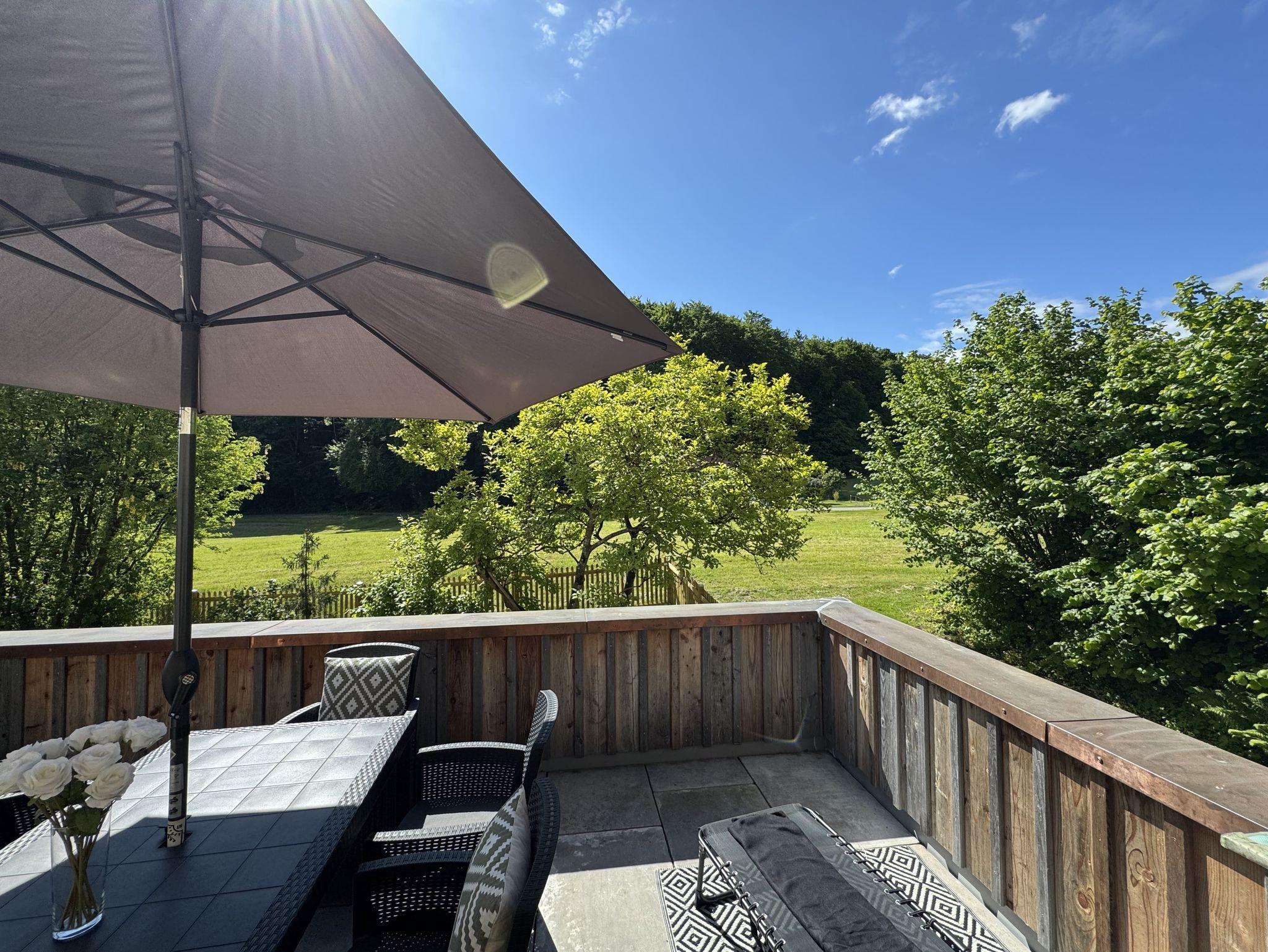 Genießen Sie die Terrasse mit Blick auf Wiesen und Buchenwald - Entspannung pur.
